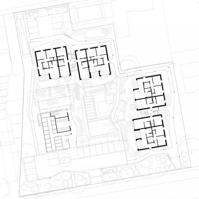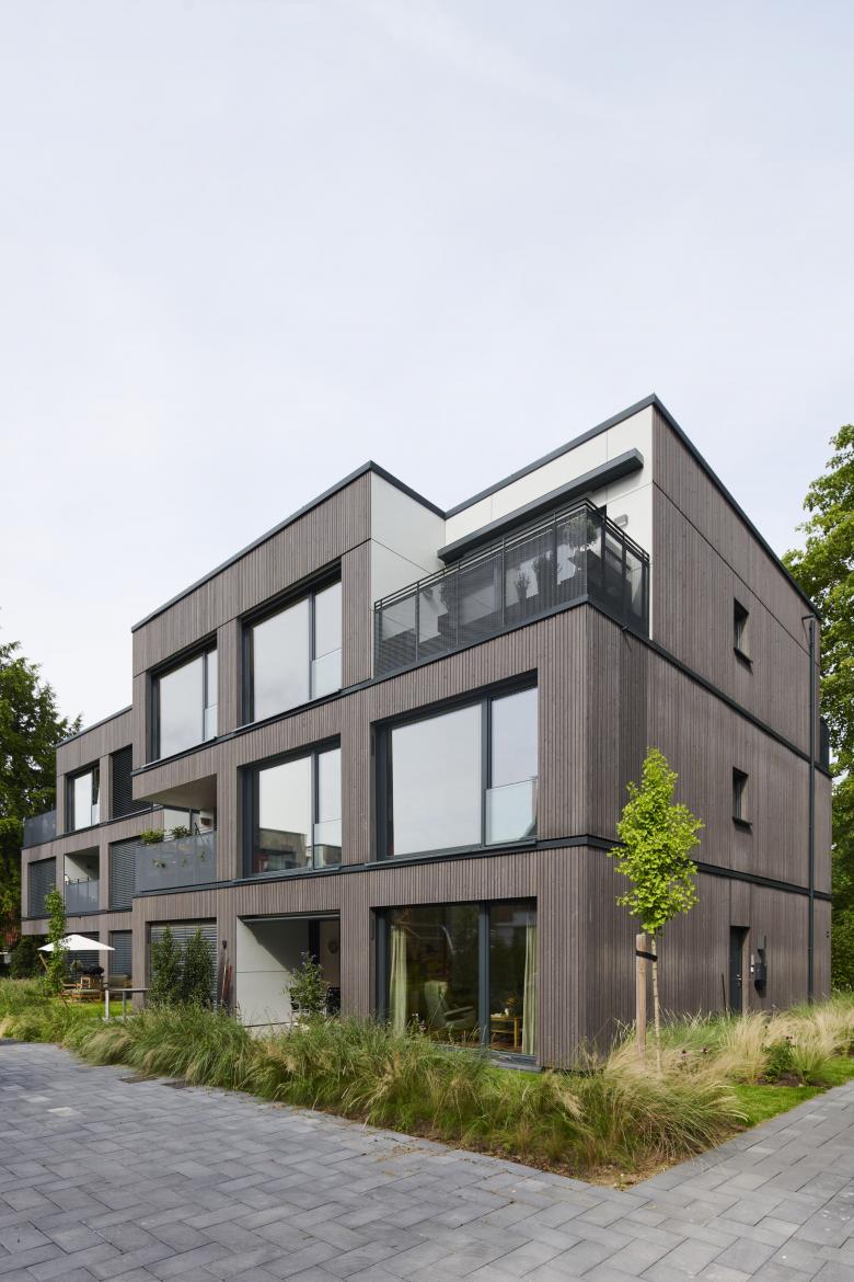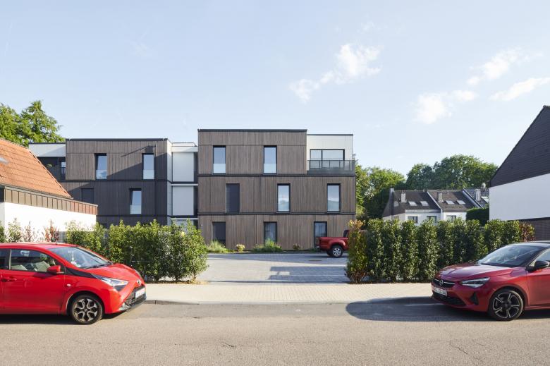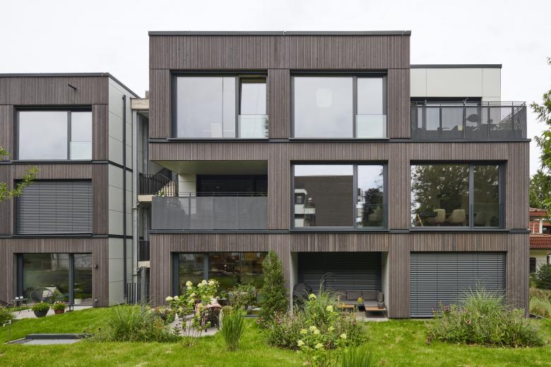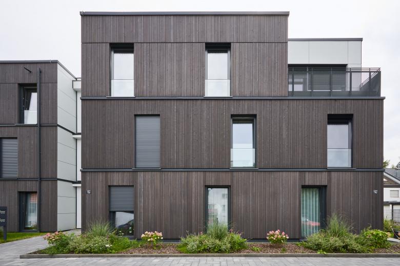 Zusammen mit einem bestehenden Gebäude bilden zwei neue Wohnhäuser - jeweils durch ein transparentes und offenes Treppenhaus in zwei Teile geteilt - einen einladenden, grünen Innenhof, der als Ort der Gemeinschaft dient. Als Energie-Effizienzhäuser geplant, wurde Holz als primäres Baumaterial nicht nur für die Konstruktion, sondern auch für die Fassadenverkleidung der Wohnhäuser gewählt. Jede Wohnung hat zudem eine großzügige Terrasse oder Loggia zum Innenhof ausgerichtet.