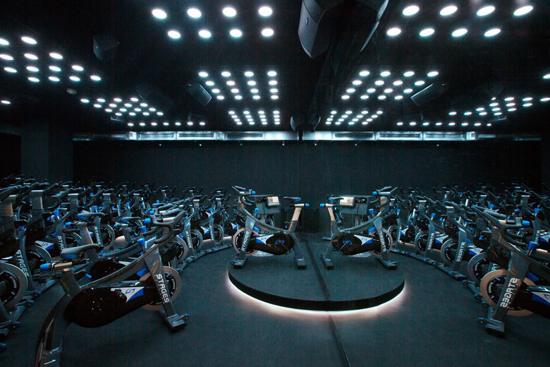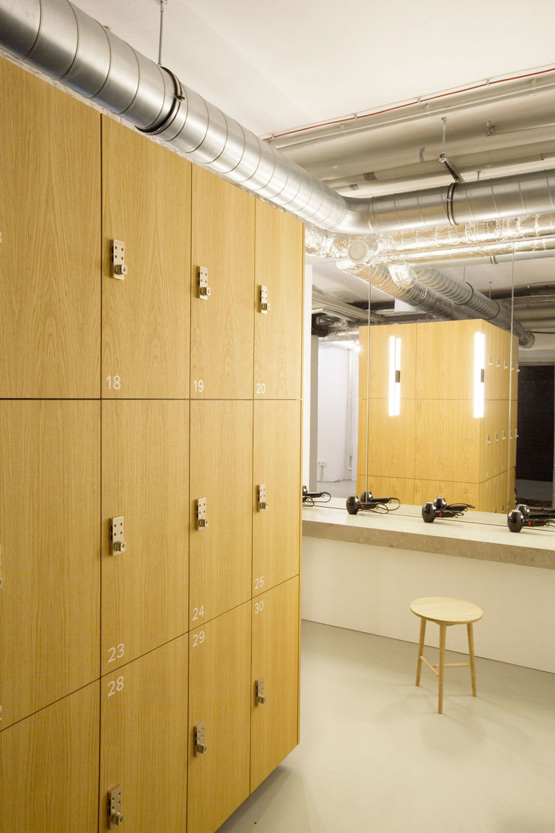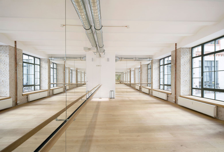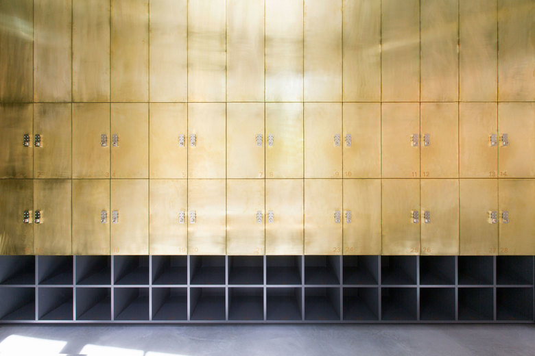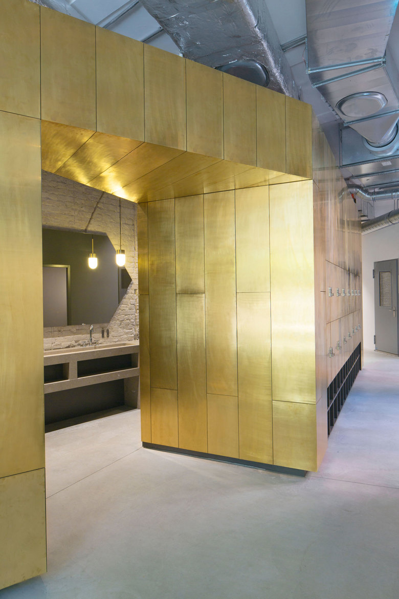 Durch den Umbau kommen die elementaren Bestandteile des alten Gebäudes zum Vorschein. Der Messingkörper bildet eine eigene räumliche Struktur und weist den Weg zu den Studios: Das Ride-Studio ist wie ein Nachtclub inklusive eigener Lichtshow. Das Yoga-Studio dagegen, ein heller, minimalistisch gehaltener Raum, sorgt durch seine ruhige Atmosphäre für Harmonie und Ausgeglichenheit.