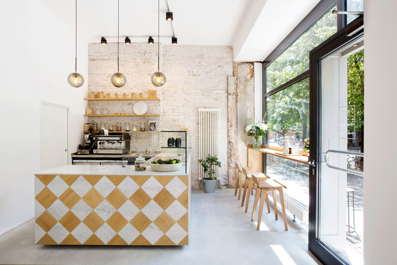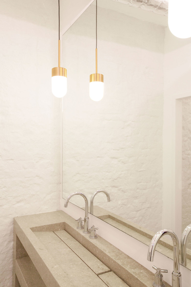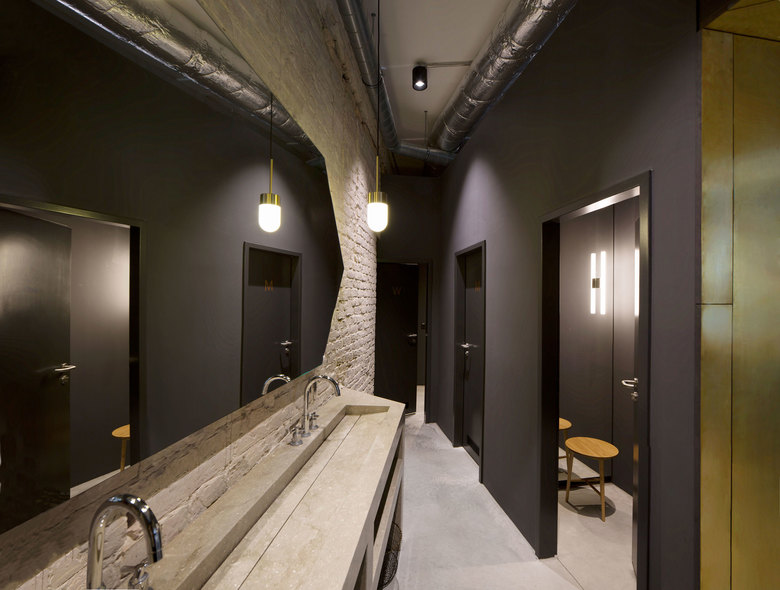 Die Kombination aus vorhandenen Materialien wie dem alten Mauerwerk und neuen Werkstoffen wie Messing, der Eiche und dem Marmor setzt sich kontinuierlich durch den gesamten Innenraum fort. Zeitgleich wird durch dieses Wechselspiel jeder einzelne Bereich auf seine eigene Art definiert.
