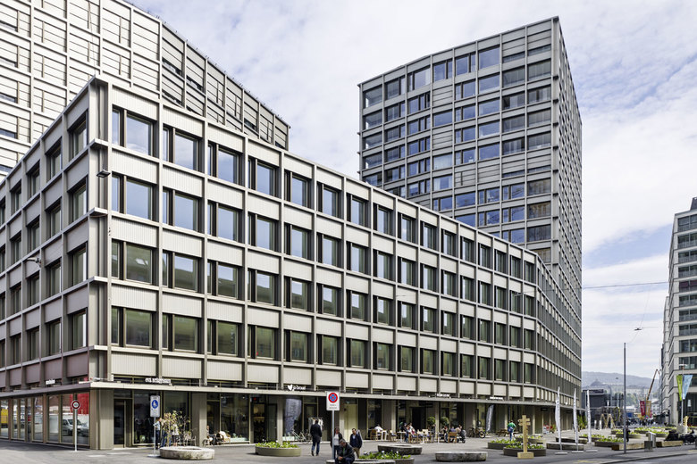 Die Tragkonstruktion besteht aus einem Skelettbau in Ortbeton und vorgefertigten Elementstützen. Die Stützen liegen nicht in einem regelmäßigen Raster. Ihre Anordnung ist das Resultat von Optimierungen über viele Stockwerke mit verschiedenen Nutzungen und dem Bestreben, Abfangungen zu vermeiden. Zum Schutz des Grundwasserträgers wurde eine äusserst dünne Pfahl-Platten-Fundation ausgeführt.