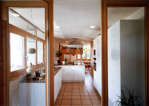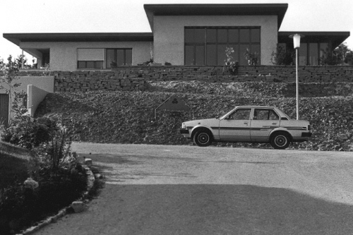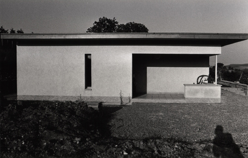 Die erste Idee des Entwurfs war ein grosses rechteckiges Flachdach, das auf einer massiven Wand aufliegt und auskragt. Gegen diese erste Setzung profilieren sich die weiteren Massnahmen: das Wohnzimmer, das aus dem Flachdach herausragt, das Schlafzimmer, das dem Hangverlauf folgend höher liegt, der Hinterhof, der sich unter dem Vordach zurückzieht.