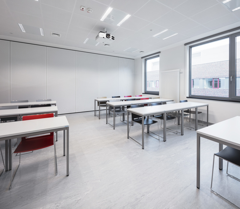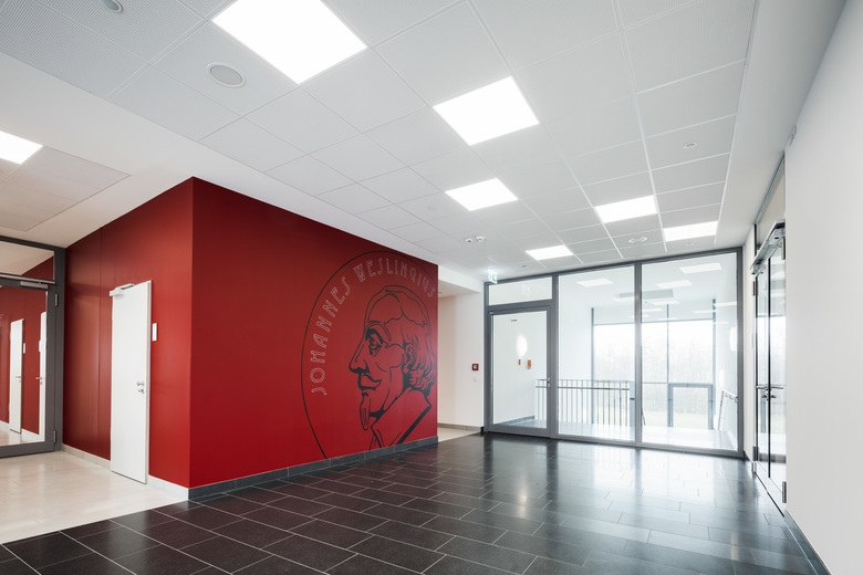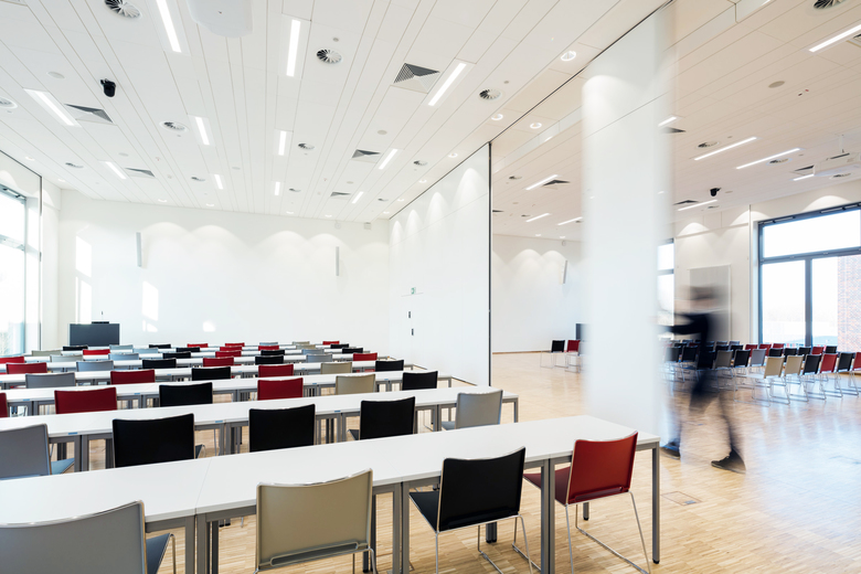 Das Herzstück des Neubaus bildet der Hörsaal. Er kann mit dem Multifunktionsraum zusammengelegt werden, so dass eine Gesamtfläche von 400 m² zur Verfügung steht. Der Erweiterungsbau wurde innerhalb von 11 Monaten errichtet. Aufgrund der verkürzten Ausführungszeit wurden die statisch relevanten Bauteile in Halbfertigteilbauweise errichtet. Insgesamt ist ein Anbau mit 1.400 m² Nutzfläche entstanden. Die Kosten liegen bei rund 10 Mio. Euro. Das Campusgebäude wurde nach KFW 70 geplant. Das Gebäude ist somit um 47% besser gegenüber der Referenz aus der EnEv 2014.