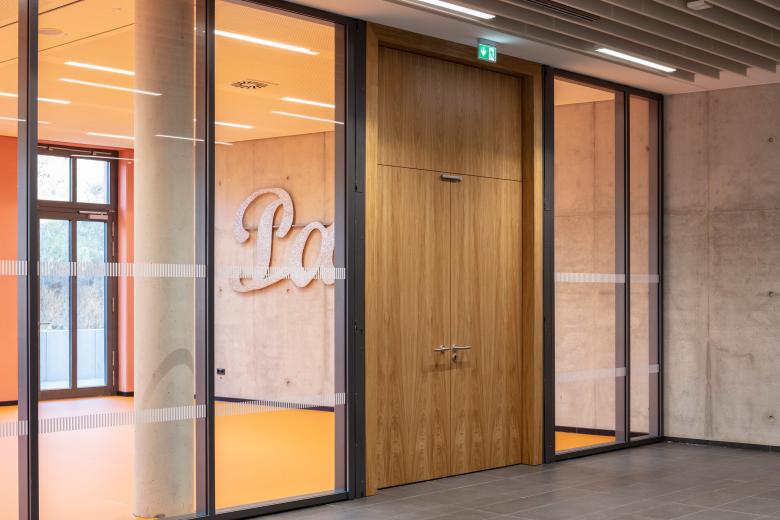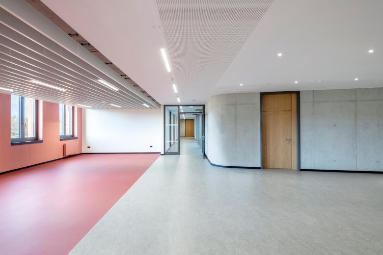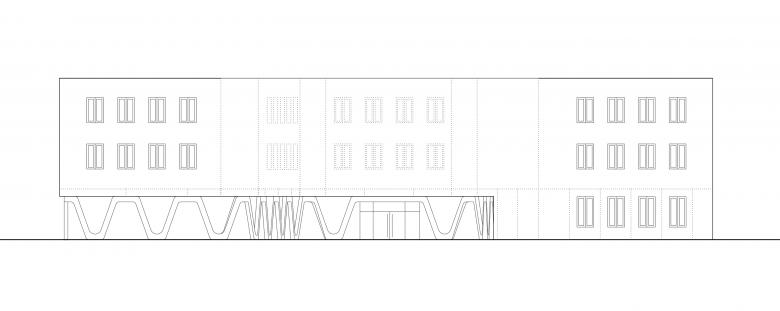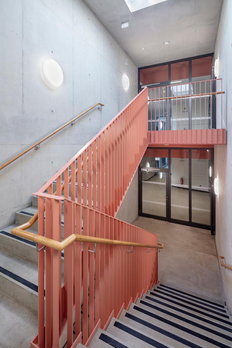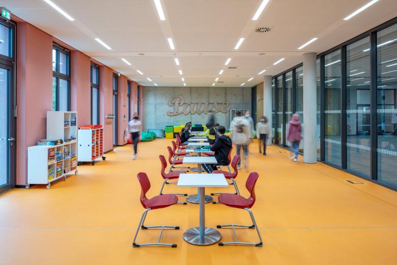 Der Komplex gliedert sich, auch über die Fassade und dessen Materialität sichtbar, in der Vertikalen. Foyer, Mensa und Spielzentrum bilden im Erdgeschoss ein Mehrzweck – Kommunikationsforum. Der Schulverwaltungsbereich ist an das Forum, wie auch zwei Treppenhauskerne angeschlossen. In den zwei Obergeschossen sind 18 Klassenzimmer mit Individual- und Teamräumen in zusammenhängenden Clustern organisiert. Die Flure weiten sich teils konisch zu Selbstlernzonen und laufen in der Gebäudemitte auf einen Patiogarten zu. Im Obergeschoss ist eine Bibliothek mit Blick auf den Campus und eine Dachterrasse mit Perspektive auf den anliegenden Wald geplant.