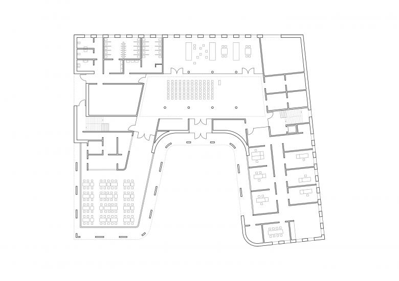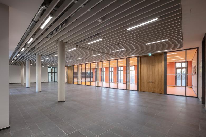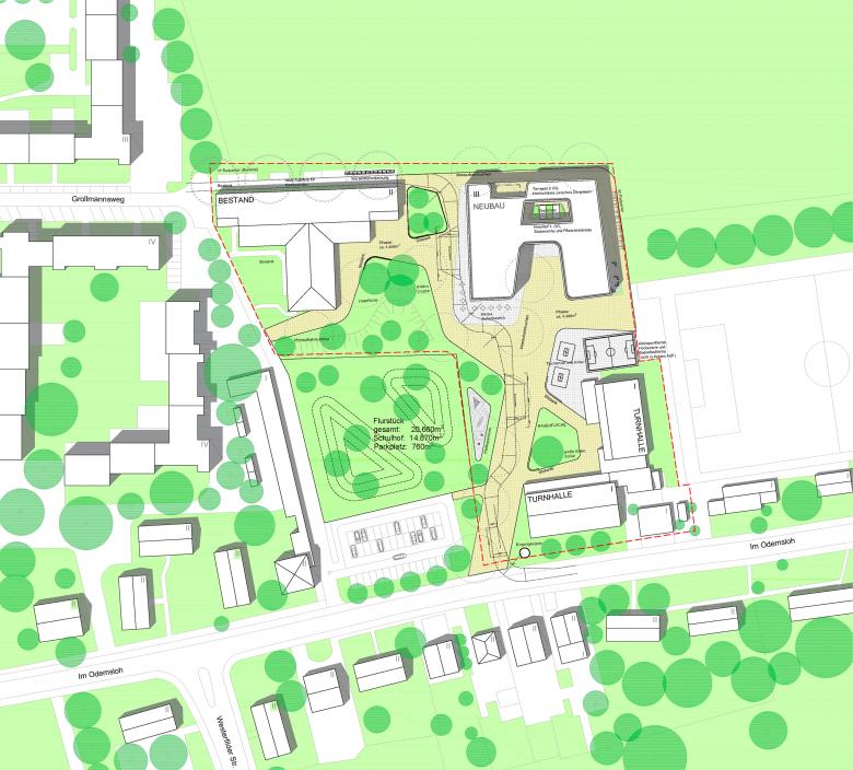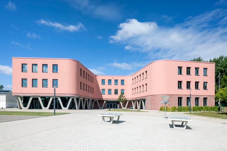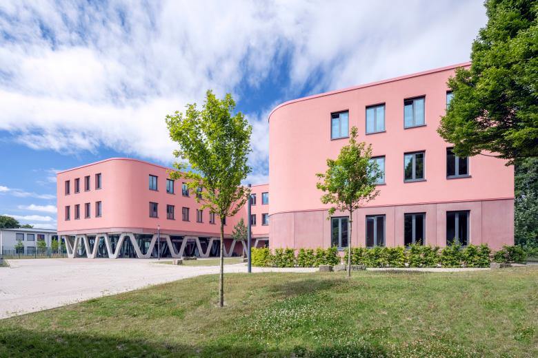 Das U-förmige Gebäude positioniert sich einladend zum Schulhof, wurde aber abgerückt von der Straße auf dem zurückliegenden Teil des Schulcampus positioniert. Mit den Sporthallen und dem naturwissenschaftlichen Erweiterungsbau bildet das Hauptgebäude eine städtebauliche Einheit.