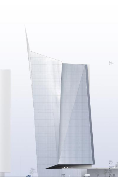 Die 2-schalige Elementfassade mit silbrig metallbedampften Prallscheiben erzeugen die monolithische Wirkung der Fassade, welche durch subtile Faltungen und Knickungen dynamisiert wird. „Einschnitte“ aus dunkel getöntem Glas unterstreichen den formalen Ausdruck und kennzeichnen die allgemeinen Bereiche des Gebäudes.