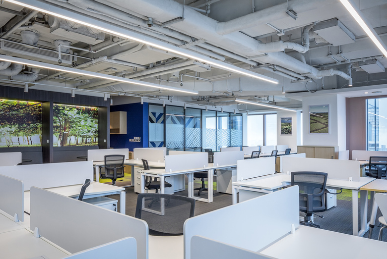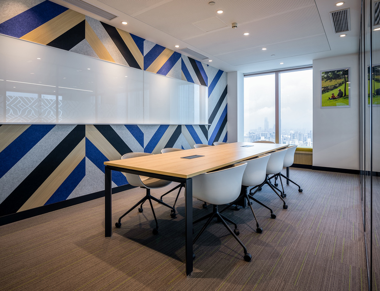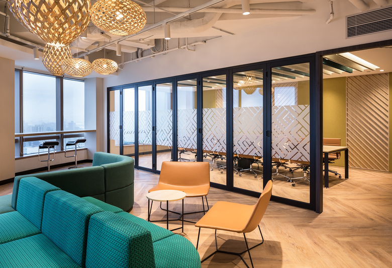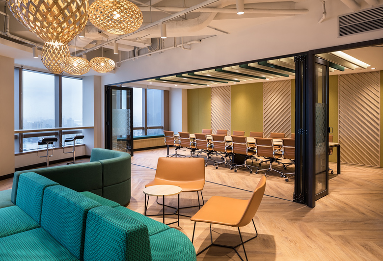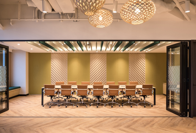 The main reception and greeting area is design to be a multipurpose space opening up to accommodate larger company events. Warm woods, woven textures, earthy greens and yellows greet you as you enter the space which looks out over an 180 degree city view.
