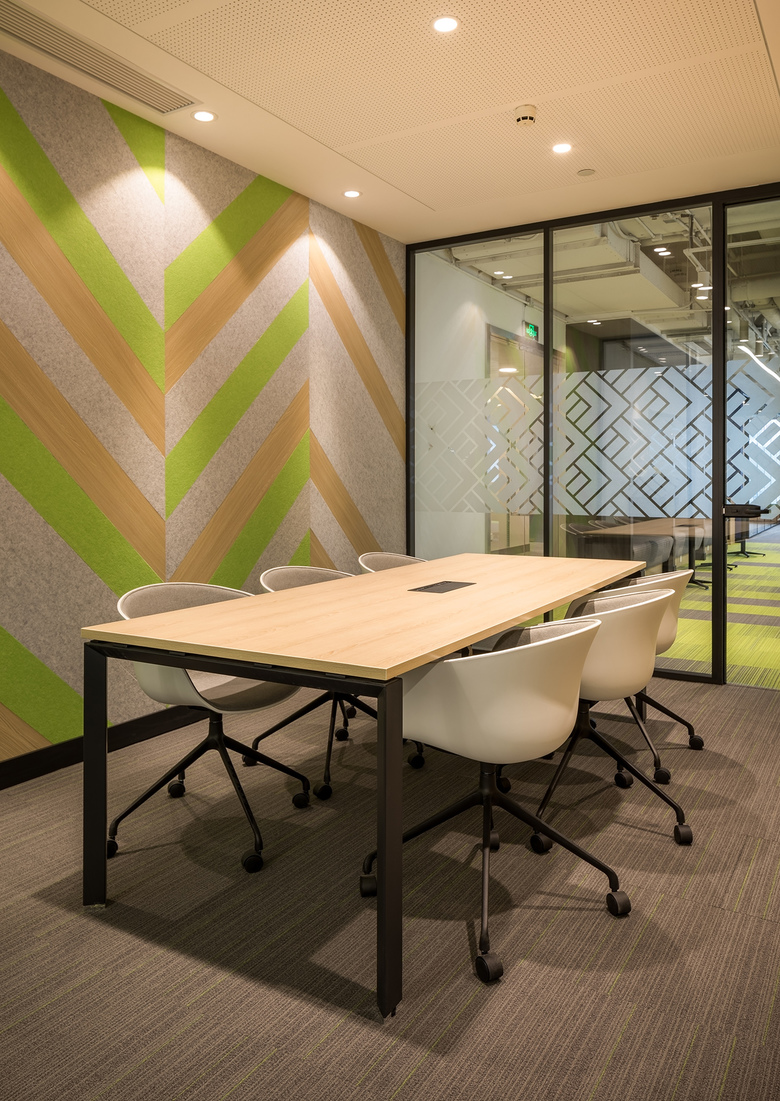 The meeting spaces are designed to bring pops of bright Zespri branding colours into the office, with a pallet of crisp white, soft grey and fresh Zespri green in the main office areas.
