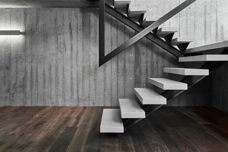 Die privaten Bereiche im Obergeschoss sind weich mit Teppich ausgestaltet und zonieren so die intimeren Bereiche des Hauses. Im Untergeschoss wurde der vorhandene Sichtbeton mit einem warmen Eichendielenboden kontrastiert, um so die benötigte Wohnlichkeit herzustellen.