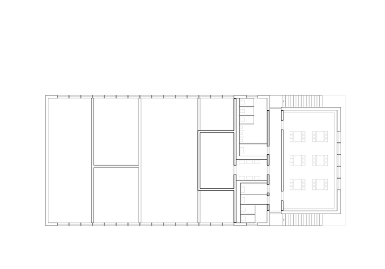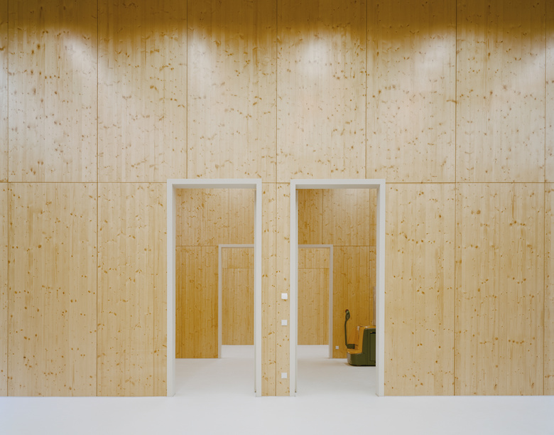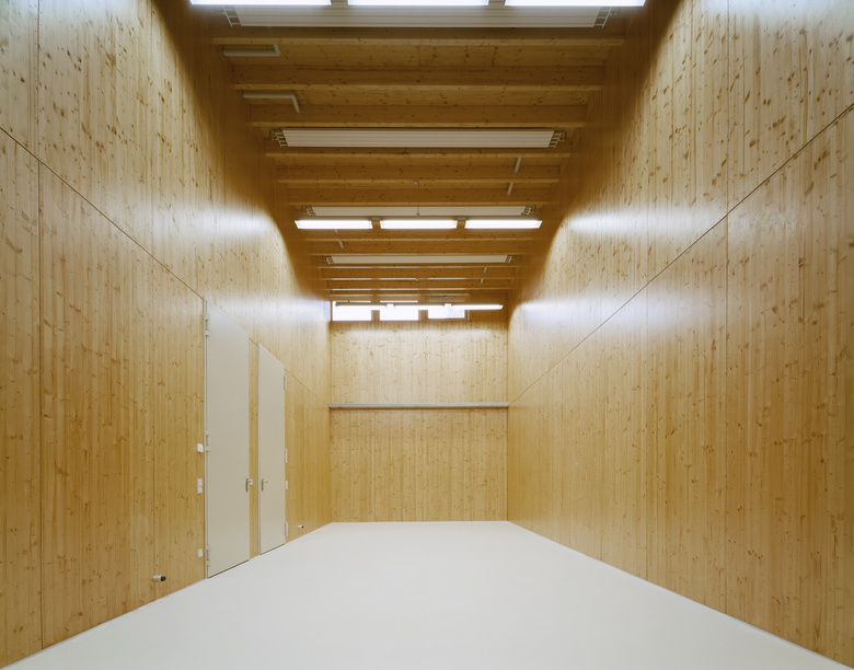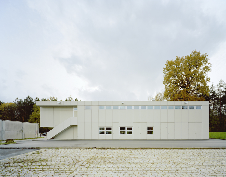 Der Neubau besteht aus einem 2-geschossigen Einbau aus Ortbeton und einem ‚übergestülpten’ kubischen Volumen in Holzbauweise. Der Einbau beinhaltet im EG die Büro- / Sozialbereiche der Mitarbeiter sowie die Schweiß- und Elektrowerkstatt. Im von außen separat erschlossenen OG des Kopfbaus wurden ein Aufenthaltsraum, Sanitärräume und der zentrale Haustechnikraum angeordnet. Im 2-geschossigen Hallenteil befinden sich die Lagerbereiche. Das Gebäude wurde in Holz- Ständerbauweise errichtet. Alle Außenwände wurden in 1,25m breiten und