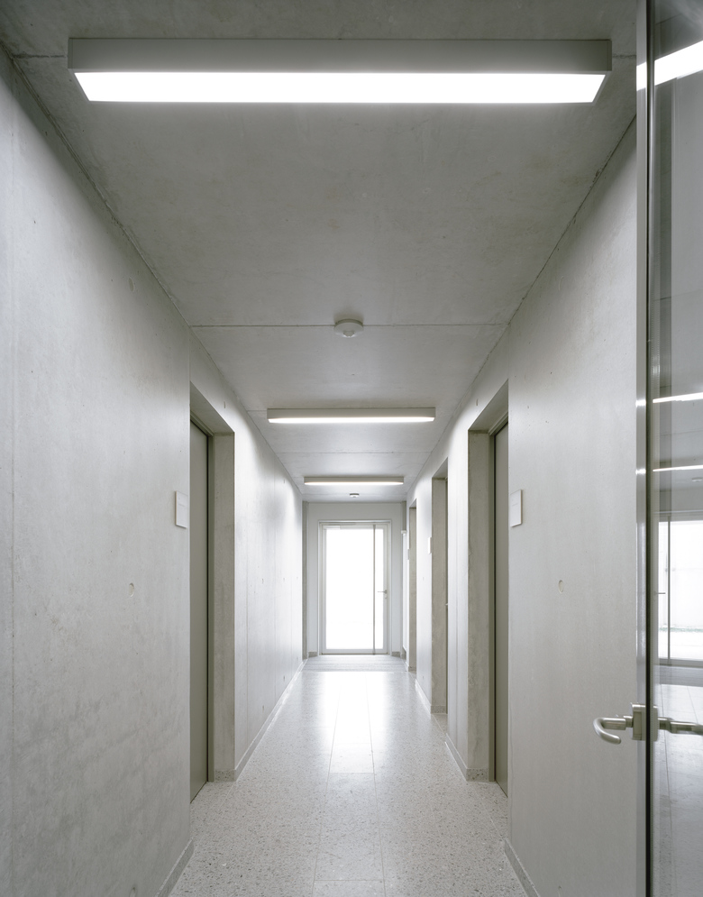gebäudehohen Wandstreifen elementweise vorgefertigt. Die Außenwandverkleidung besteht aus hinterlüfteten weißen Faserzementtafeln im Regelformat 125cm x 300cm.