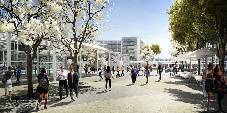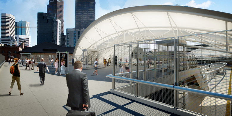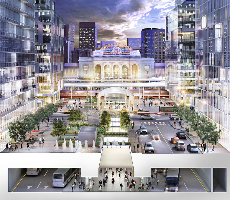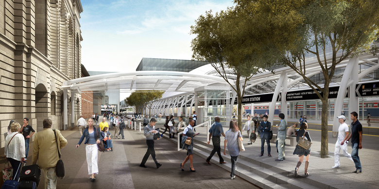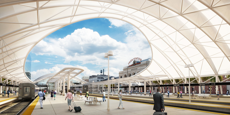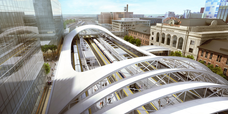 The Denver Union Station development knits together light rail, commuter and intercity rail, regional and local buses, downtown shuttle buses, taxis, shuttles, vans, limousines, bicycle routes and pedestrian networks into a 21st-century intermodal transportation hub and urban transit district. The new commuter rail terminal, light rail station and below-grade bus terminal create a connected constellation of transportation programs distributed across the 42-acre redevelopment area. Adjacent to Denver’s CBD, with a revived historic Union Station building as its focal point, the emerging Union Station neighborhood anchors and seamlessly connects the two smart growth neighborhoods in the heart of the city — Lower Downtown and the Central Platte Valley.