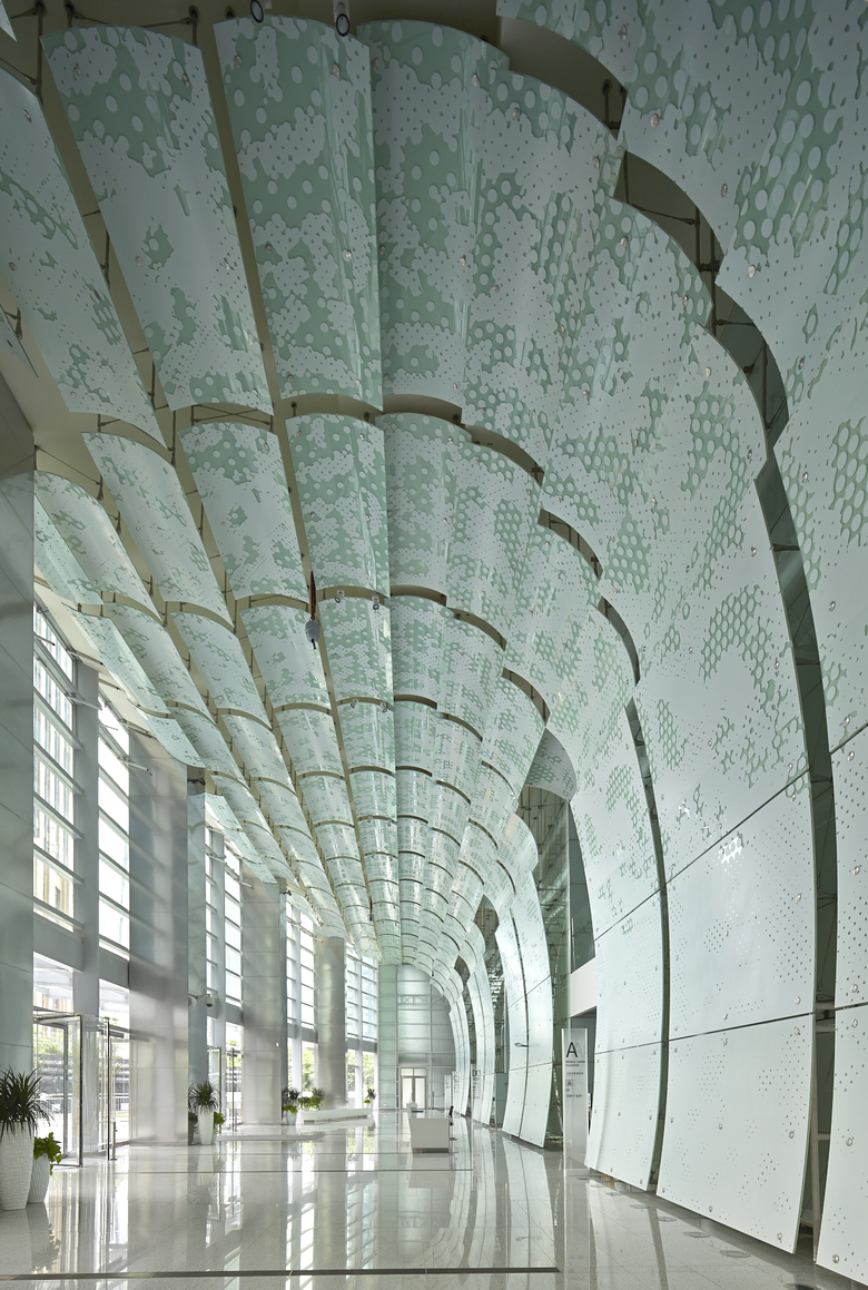 The 2.3-million square-foot Pearl River Tower redefines what is possible in sustainable design by incorporating the latest green technology and engineering advancements. The 309-meter tower's sculpted body directs wind to a pair of openings at its mechanical floors, where traveling winds push turbines which generate energy for the building. The design for the tower incorporates a series of other integrated sustainable and engineering elements, including solar panels, double skin curtain wall, chilled ceiling system, under floor ventilation air, and daylight harvesting, all of which contribute to the building’s energy efficiency.