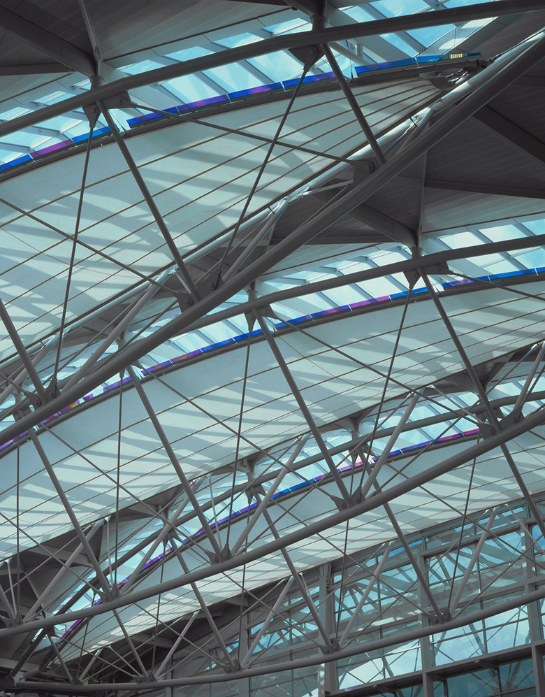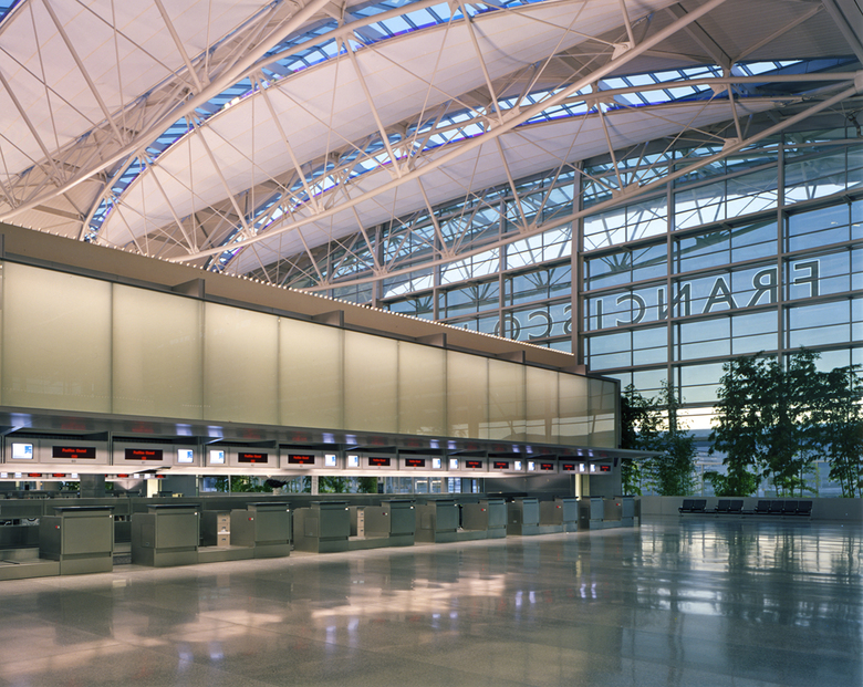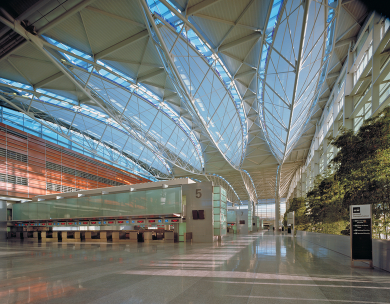 This 1.8-million-square-foot terminal creates a powerful identity for both the airport and the City of San Francisco. Its form and aesthetic stem directly from functional necessity—the roof’s wing-like form directly expresses the structural diagram of its bending forces. So the facility would remain operational in the event of a major earthquake, SOM engineered the structure to the highest seismic safety requirements ever imposed on an American airport terminal. This strategy incorporated the most ambitious use of base isolation technology for the time.