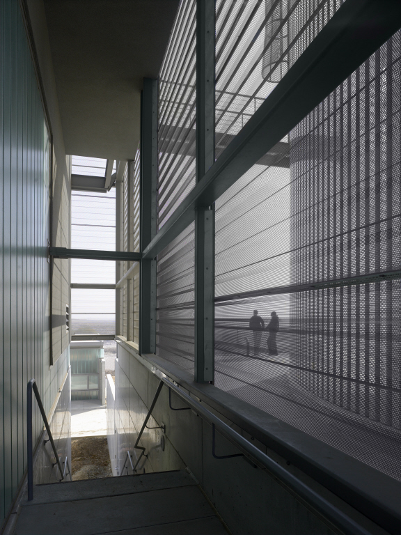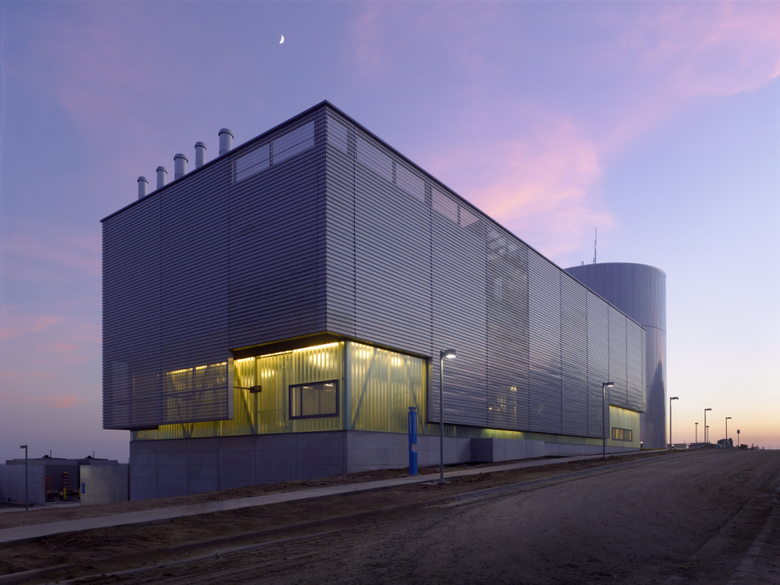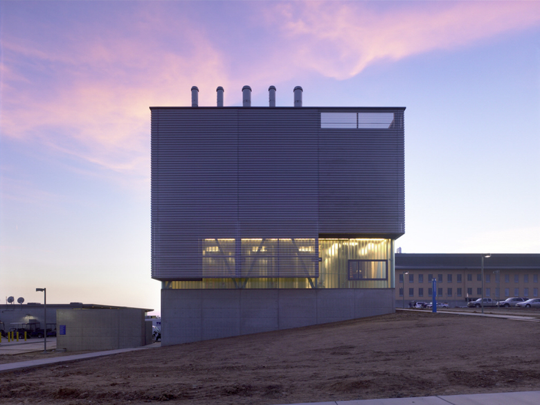 This complex is part of the first phase of a new university campus for the state of California. In addition to providing power for the university’s first-phase buildings, the plant also plays a key role in achieving the ambitious sustainable design goals outlined by the Board of Regents—20 percent lower than any existing campus in the system and a campus-wide Silver LEED™ rating. The exterior walls of the plant and tank are sheathed in an outer layer of corrugated metal panels similar to the ubiquitous grain silos, farm sheds, semi-trucks, and freight cars found in the valley. The finish of the stainless steel panels captures and reflects the entire spectrum of the brilliant Central Valley summer sun.