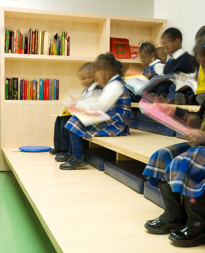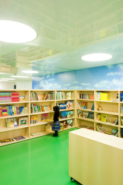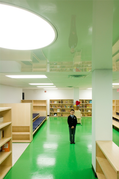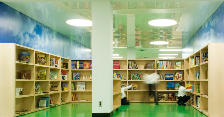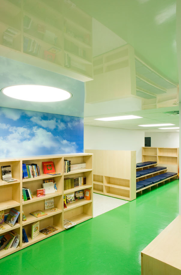 Because the area designated for the new library is below grade, we strove to create a sense of openness and brightness by incorporating a reflective ceiling, bright murals and lighting.