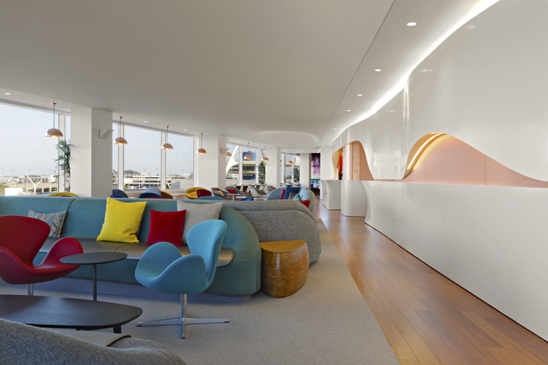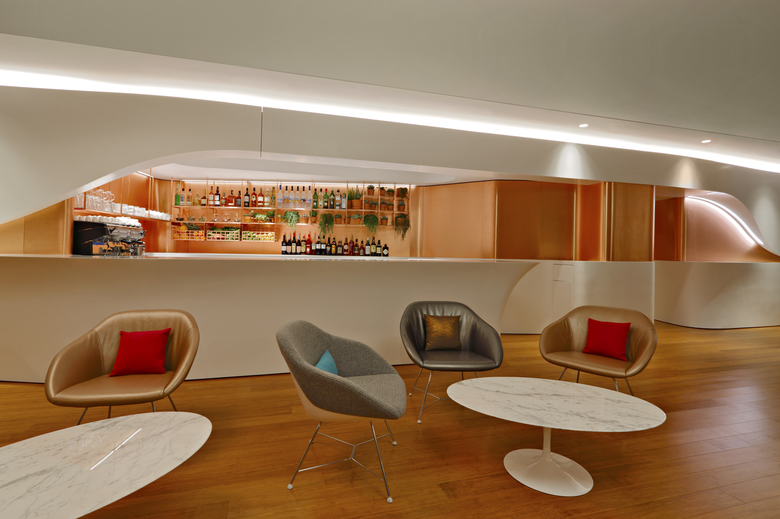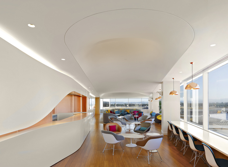 The lounge recalls LA’s warm sunsets, flowing surf, laid back lifestyle, mountain backdrops, smooth curves and sculpted surfaces. The reception area envelopes guests in a calm, cleansing environment sheltered from the bustle of the terminal. Leading into the main lounge is a sculpted Corian and copper Flow Wall that continues into the space and cuts diagonally through the lounge as a backdrop for the Clubhouse opposite continuous views that include aircraft, LAX’s iconic Theme Building, runways, the Hollywood Hills and the Hollywood sign.