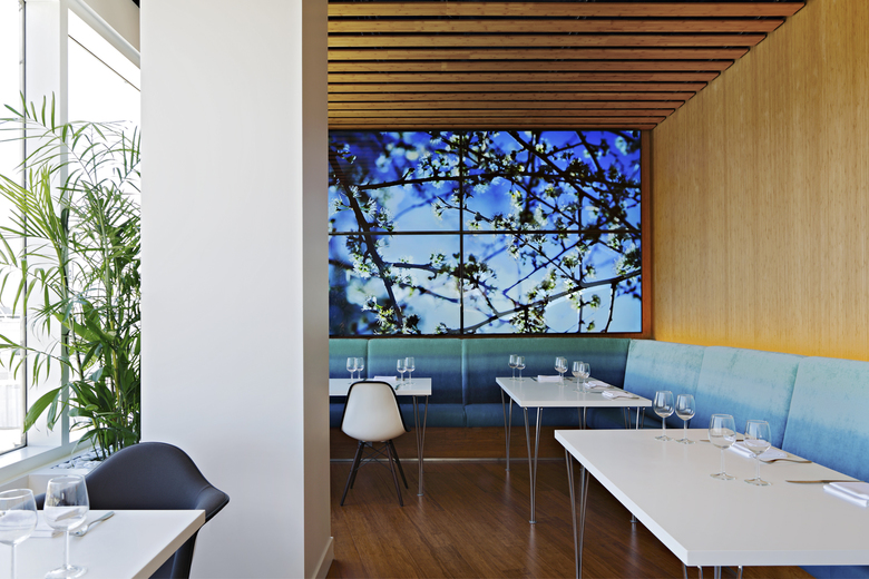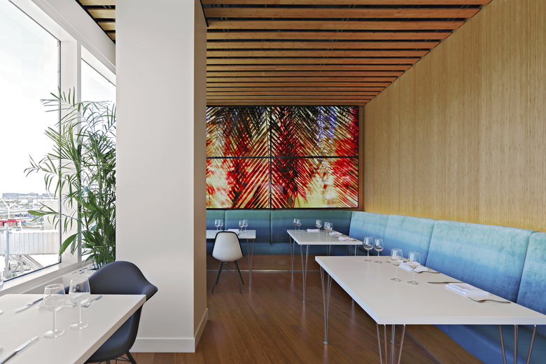 The apex of the triangular lounge space, beyond the tip of the Flow Wall, encloses The Conversation in warm bamboo lines walls and ceilings framing the Diana Reichenbach video installation. Leather banquets lining this room provide an intimate get-away within the clubhouse. This is the perfect place to enjoy an inspired Virgin Atlantic crafted dinner inspired by Californian lifestyle.