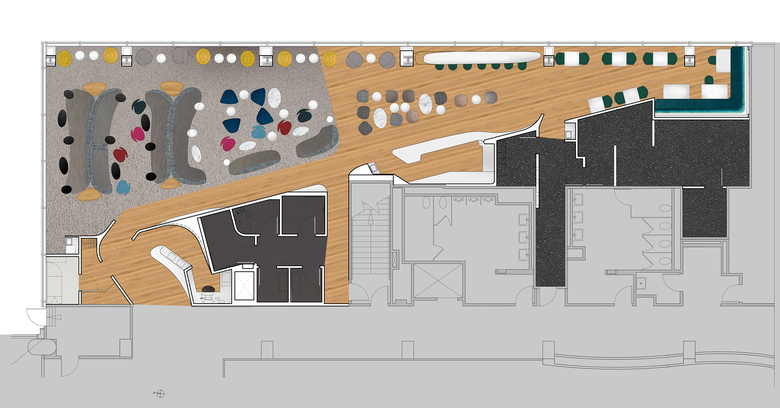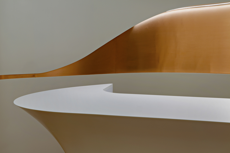 The sinuous Flow Wall defines a distinct variety of spaces each furnished to provide varied seating and social possibilities within the triangular shaped lounge volume. At the widest part of the triangle, this space is defined by custom designed landscape-like sculpted couches and end tables that provide a variety of relaxed seating that recalls dunes and rolling hills at the glass corner of the lounge facing views of the Hollywood Hills and mountains beyond. Swan chairs by Arne Jacobsen compliment the sculptural language in this area.