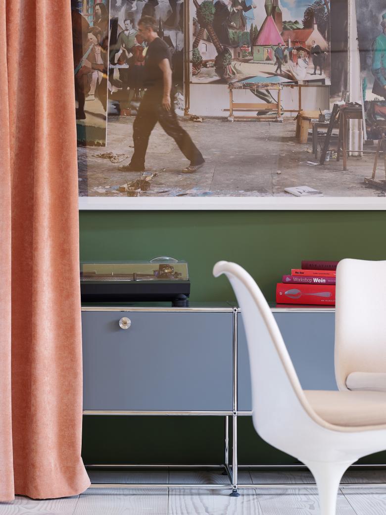Den räumlichen Abschluss zum Nachbargebäude bildet eine raumbreite Vorhangwand, die sowohl akustisch als auch visuell wirkt. Sie lässt sich öffnen und gibt einen Arbeitsplatz sowie Stauraum frei – flexibel nutzbar je nach Tageszeit oder Stimmung. Der Raum erhält so ein wandelbares zweites Gesicht: mal Bibliothek, mal Büro, mal ruhiger Rückzugsort. Textile Elemente übernehmen dabei die Rolle klassischer Türen und Wände – mit Leichtigkeit und Eleganz.