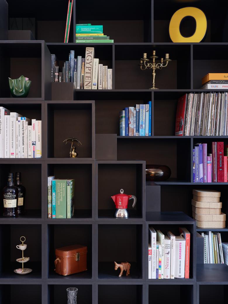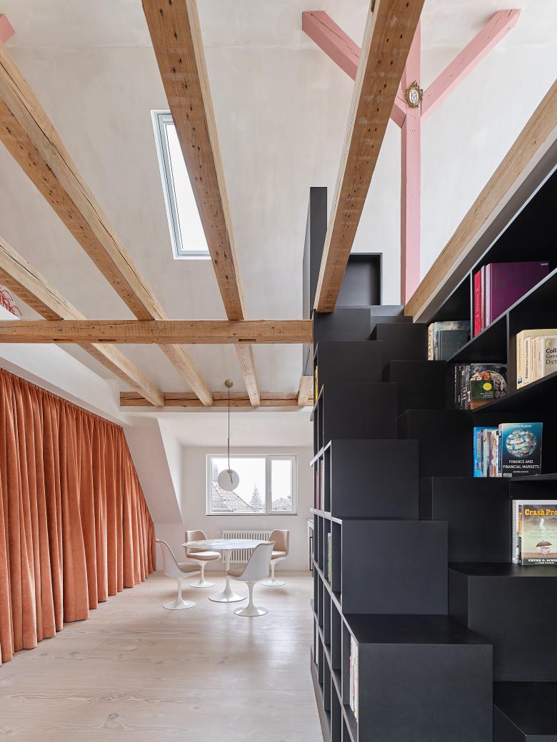 Ein aus schwarzem MDF gefertigtes Raummöbel erschließt als begehbares Regal den Wohnbereich im Spitzboden. Die zuvor abgetrennte Decke wurde auf ihre Balkenlage zurückgebaut, sodass ein neuer Raumbezug zwischen Ess-, Arbeits- und oberen Wohnbereichen entsteht. Der Spitzboden, einst reine Abstellfläche, wurde über gezielte Dachöffnungen aufgewertet und lädt heute mit Ausblick auf die Weinberge und den Fernsehturm zum Verweilen ein – ein Ort zwischen Geborgenheit und Weite.