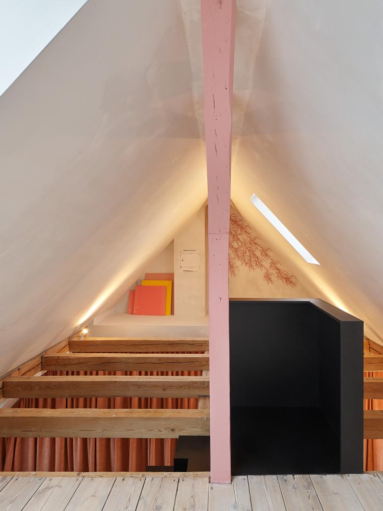 Die Material- und Farbwahl folgt einer klaren gestalterischen Linie: Natürlichkeit, Lebendigkeit und Ausdrucksstärke. Unbehandelte, gelaugte Douglasien-Dielen aus dem Schwarzwald schaffen eine warme Basis. Das schwarze MDF des Treppenmöbels, lachsrot gestrichene Dachbalken sowie abgestimmte Wandfarben und Textilien setzen Kontraste. Alles wurde bewusst gewählt, um eine Atmosphäre zu schaffen, die zugleich ruhig und kraftvoll wirkt – zurückhaltend und doch markant.