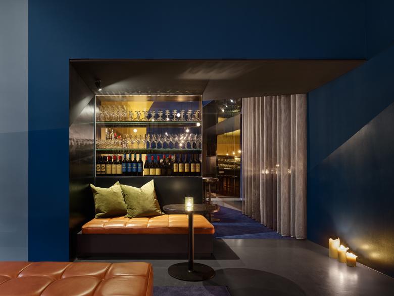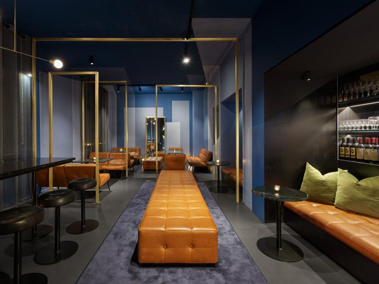 Der Barbereich hebt sich durch seine dunklere Farbgebung deutlich von der sich in Endlosigkeit verlierenden Welt aus farbigen Flächen ab. Ein am Boden beginnender Teppich lässt den Gast mehr haptisch denn visuell den Zugang zunächst erfühlen - er lädt in eine weiche und gedämpfte Welt ein - setzt sich an der Wand fort und ergibt sich in einer akustisch wirksamen Spanndecke. Das stark gedimmte Licht setzt den Fokus genügsam auf die Gesichter der Gäste – die Wärme und Struktur des tief schwarz lackierten Holzes der Theke bleibt mehr spürbar denn sichtbar – der Blick des Gastes wird auf die mit echtem Messing bekleidete und teilweise verspiegelte Bar gelenkt, welche raumbildend wieder in der ihr gegenüberliegenden Wand aus unterschiedlich getönten, reflektierenden Glasflächen erscheint.