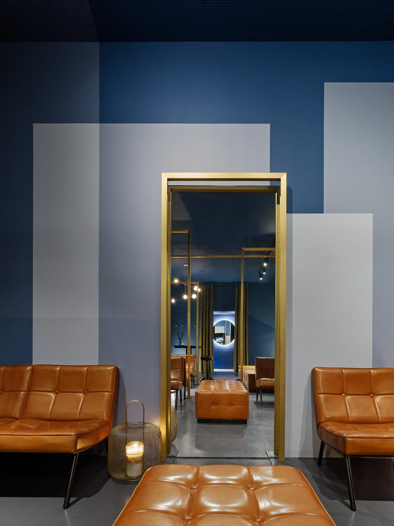 In verschiedensten Nuancen verblassende Blautöne überlagern sich in Flächen, lösen den Raum auf, konterkarieren die Perspektive und spielen mit der Wahrnehmung des Gastes. Messingfarbene Rahmen unterschiedlicher Dimensionen scheinen den Raum dann wieder angenehm zu gliedern. Die Tische aus hochglanzpoliertem schwarz-grünem Marmor treten in den Hintergrund während die homogen in naturbelassenem Leder, vom lokalen Handwerk ausgeführten Sitzelemente einen deutlichen Kontrast bilden. Ihr Arrangement schafft unterschiedlichste Aufenthaltsqualitäten: von intimen Sitznischen und großzügigen Sitzgruppen, bis zu einer offen gestalteten Sitzlandschaft oder einem halbhohen Sitz-Stehtisch als unverbindliche Kommunikationsorte.