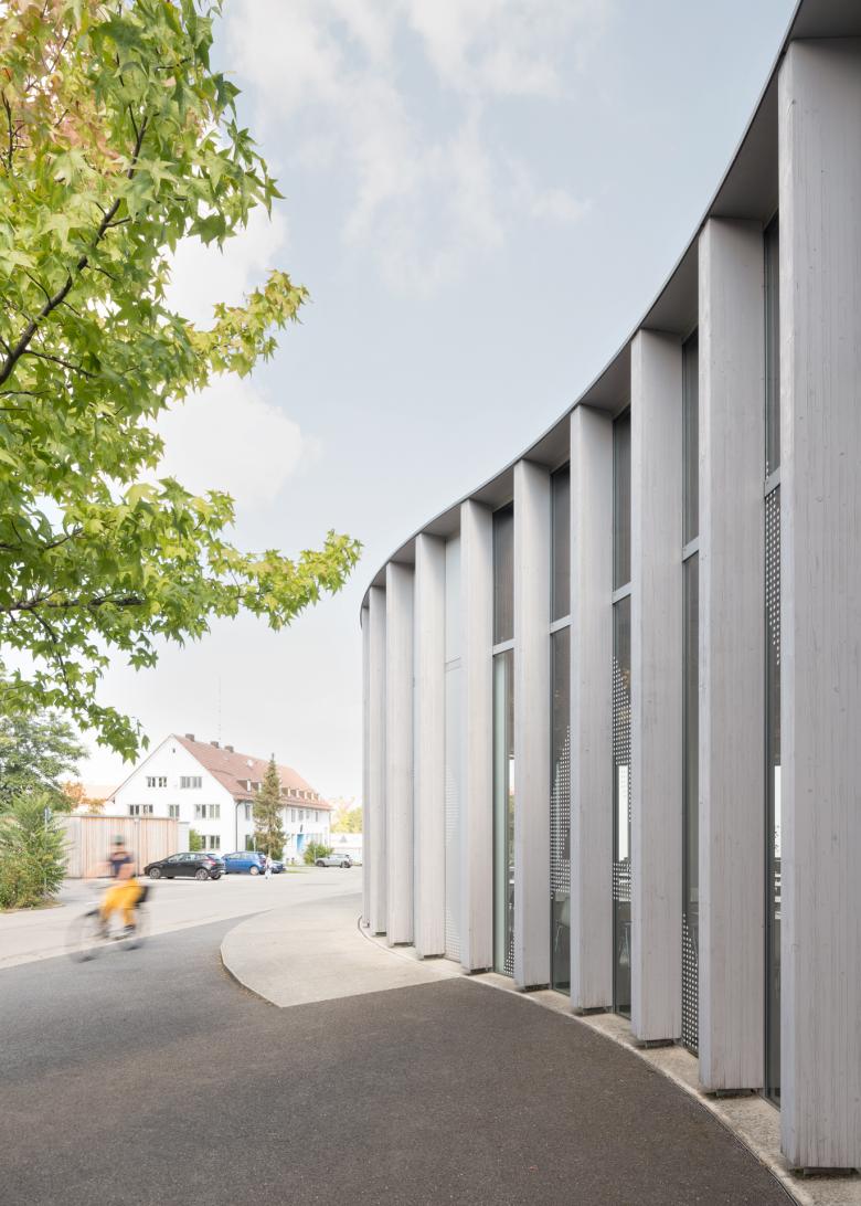Wirtschaftlichkeit – Die kompakte Anordnung der Funktionsbereiche sowie verschiedene effiziente Bestuhlungsvarianten ermöglichen gleichzeitig die Aufwertung der Bewegungsflächen bei einer geringen Gesamtfläche. Die Reduktion auf wenige unterschiedliche Elemente sowohl im Bereich des Tragwerks als auch der Fassade erlaubt einen hohen Grad an industrieller Vorfertigung in hoher Stückzahl. Die äußeren Holzstützen sind sowohl Konstruktion als auch Teil der Fassade. Der Funktionskern übernimmt die Gebäudeaussteifung. Als thermische Hülle wechseln sich jeweils identische verglaste und geschlossene, gedämmte Elemente in loser Folge ab.