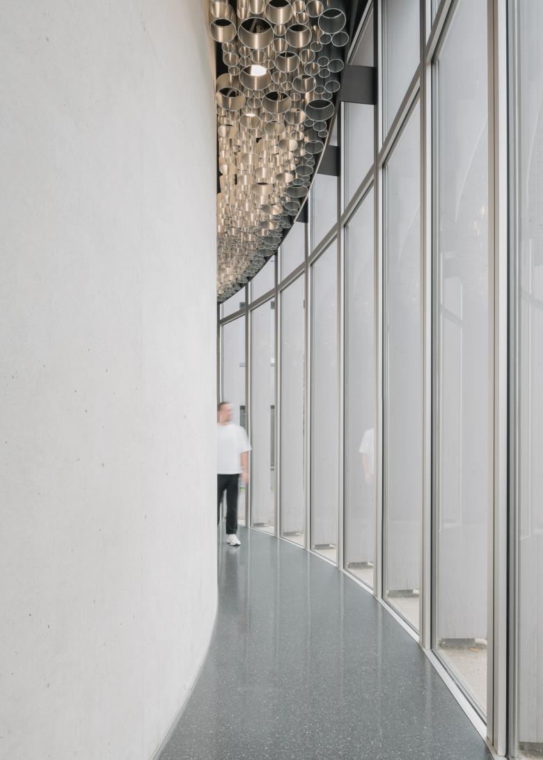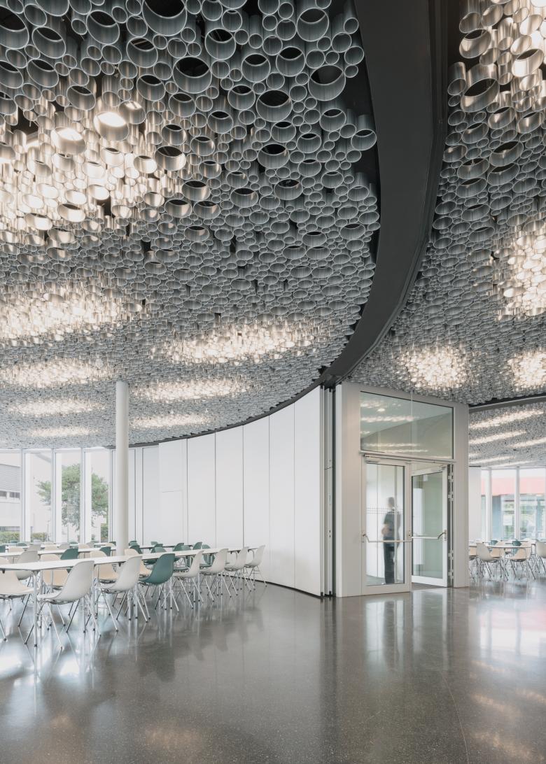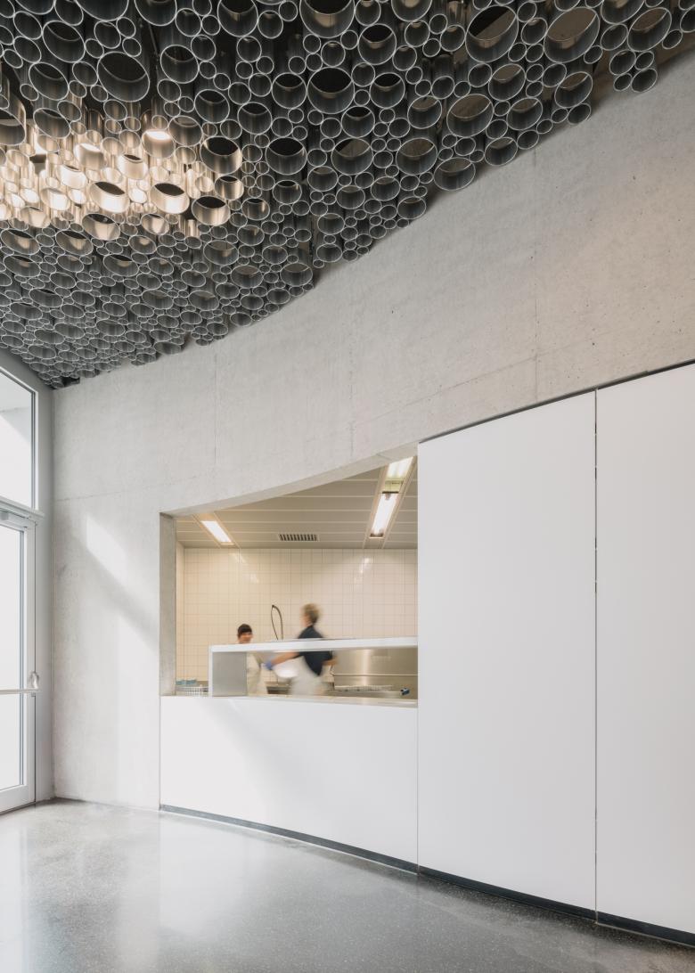 Entwurf – Die offene vertikale Struktur der Konstruktion definiert sowohl Außen- und Innenraum ohne diese voneinander zu trennen. So ergibt sich ein fließender – auch im Inneren lichtdurchfluteter – Raum, der differenzierte wie vielfältige Nutzungszonen ermöglicht. Unterstützt wird die räumliche Verzahnung durch raumhohe Glaselemente sowie die optische Fortsetzung des Bodenbelags. Der dunkle Asphaltbelag des Außenraumes wird im Innenbereich durch einen dunklen Gussasphalt fortgesetzt. Der Sichtbeton des Funktionskerns mit seinem eingebauten Corian Thekenelement ergänzt die reduzierte Materialwahl. Die Abhangdecke aus zusammengesetzten Aluminiumröhren unterschiedlicher Größe ist vom Rand abgesetzt. Die drei kreisförmigen Raumzonen sind an der Decke durch breite schwarze Bänder ablesbar. Die darin laufenden Trennwandelemente ermöglichen eine flexible Raumnutzung. Großzügige Bewegungsflächen bieten neben dem Speise- und Rückzugsbereich zusätzliche Aufenthaltsqualität und vermeiden zusammen mit angemessen dimensionierten Zugängen Engstellen im Bereich der Verkehrsflächen. Sämtliche Nebenräume und die Küche befinden sich konzentriert in einem Rondell. Küche und innenliegende Arbeitsräume werden über Oberlichter natürlich belichtet.
