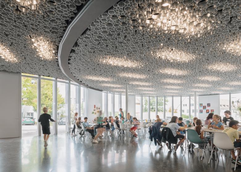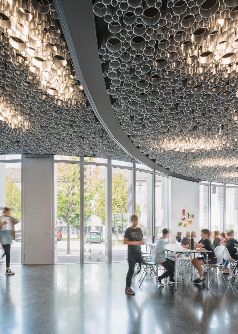 Die neue Mensa des Schulzentrums Stadtmitte ist Dreh- und Angelpunkt des gemeinsamen Schullebens, Treff- und Sammelpunkt, Ort der Begegnung und des gemeinsamen Essens. Als zentrale Anlaufstelle wird die Mensa für alle drei Schulen zum gemeinsamen identitätstiftenden Ort. Die vielfältigen Nutzungsanforderungen des sozialen Schullebens werden durch verschiedene Bereiche erfüllt, die sich über die gesamte Platzfläche zwischen zwei der drei Schulen verteilen – es bildet sich ein räumlich funktionales Kontinuum zwischen Innen und Außen.