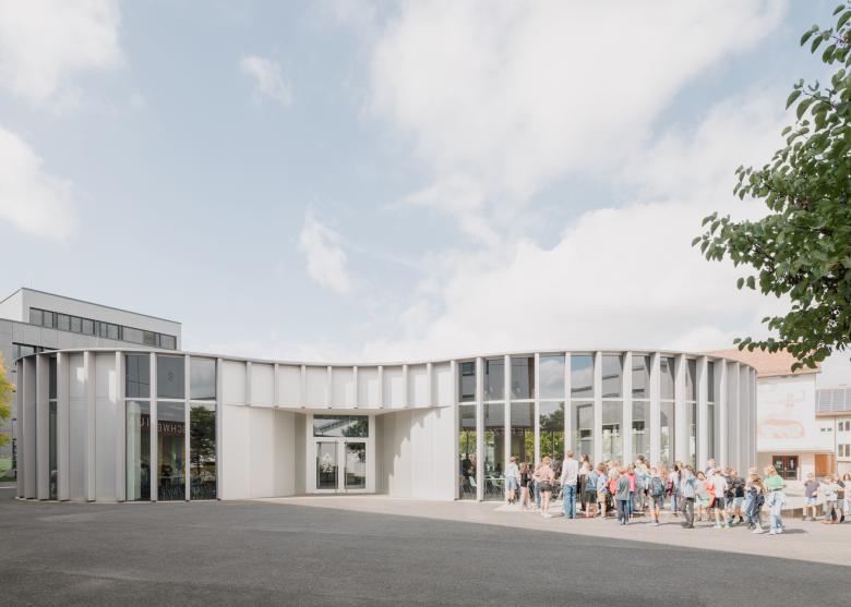 Mehr Platz als Haus Anstatt die heterogene städtebauliche Struktur des Schulzentrums fortzusetzen, versteht sich die neue Mensa als Platz zwischen den Bestandsgebäuden. Am westlichen Platzende befindet sich der Funktionsbereich sowie die Anlieferung, während sich die Speisebereiche zum südlichen und östlichen Teil des Platzes orientieren. Am nordöstlichen Ende erfolgt der Hauptzugang von der Straße. Nach Südosten öffnet sich die Fläche zum Grünbereich zwischen den Schulen.