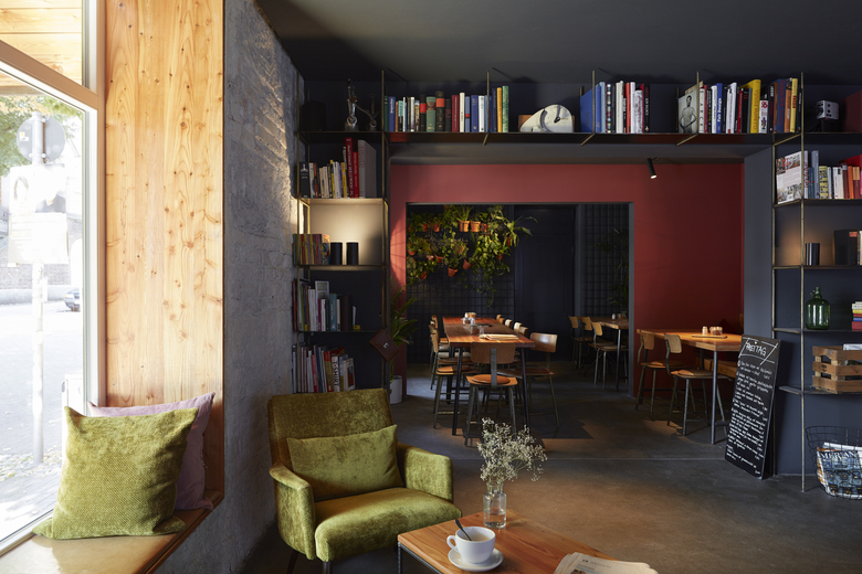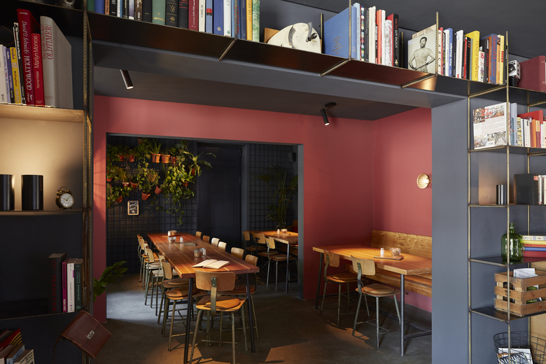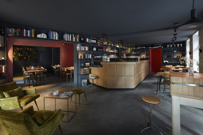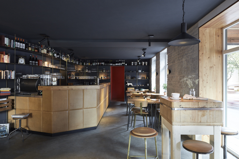 Das in drei Teilräume gegliederte Lokal – einen Hauptgastraum mit Theke sowie zwei weitere kleinere, intimere Raumbereiche – bietet den Gästen ein gut abgestimmtes Angebot an Sitzmöglichkeiten, vom informellen Zusammenkommen im Loungebereich, der sich um eine tiefe hölzerne Sitznische in der Fensterleitung zum Platz orientiert, sowie an der mit Rindslederpanels bekleideten Bar, die den Hauptraum dominiert, bis hin zu intimen Sitznischen mit einfachen Bänken aus gebürstetem Lächenholz. Im hinteren der beiden kleinen Räume bilden an einfachen Bewehrungsmatten in Tontöpfen aufgehängte Grünpflanzen ein lebendiges und natürliches Wandbild, das sich klar vor dem schwarzen Wandhintergrund abzeichnet.