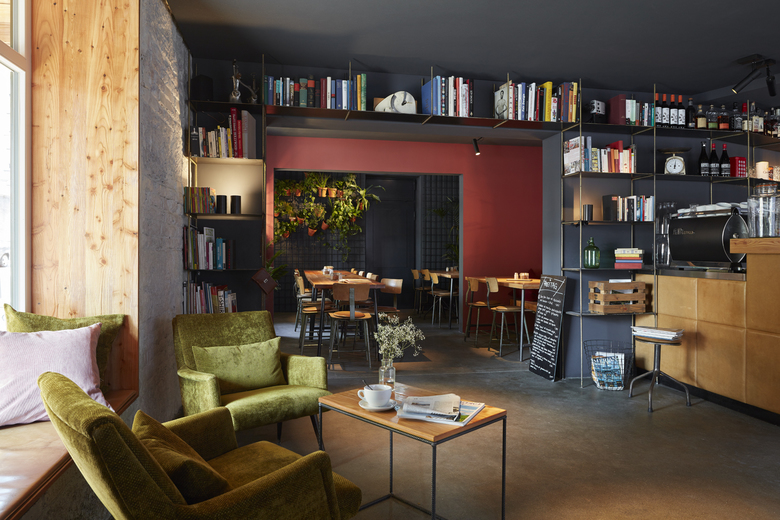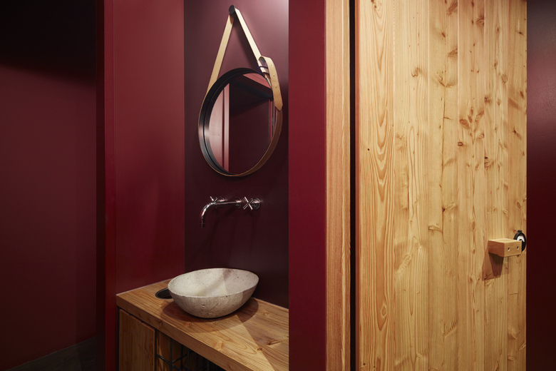 Authentische Materialien und Natürlichkeit prägen die Stimmung. Die Materialauswahl beschränkt sich hierbei im wesentlichen auf mit Öl behandelten Rohstahl, Leder und gebürstetes Lärchenholz. Begleitet werden diese Materialien von den Farbtönen der Wände zwischen Schwarz, Blutrot und zartem Rosa. Die klare Anmutung des Raums mit seinem archaischen Mobiliar kontrastiert mit den Akzentwänden aus zartem Rosa, verspieltem Tischgedeck und spannendem Flohmarktfundus. Kleine Details wie die runden Ledersitzkissen mit roter Naht, die das Sitzen auf den rustikalen Werkstattstühlen angenehm machen, offenbaren die Auseinandersetzung mit jedem Detail, was sich auch in der Küche widerspiegelt.