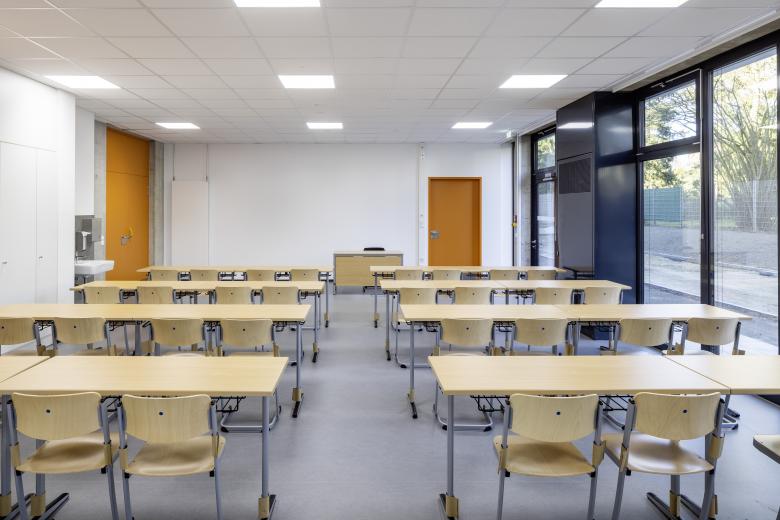 Ein grünes Klassenzimmer für Musik ist eines der vielen Beispiele für die Umsetzung der neuen pädagogischen Konzepte. Die Realisierung von Lernclustern, Schaffung offener Lernlandschaften und die Gestaltung eines geschützten Außenbereichs für die jungen Unterstufenschüler sind weitere Komponenten für einen zukunftsorientierten Schulneubau.