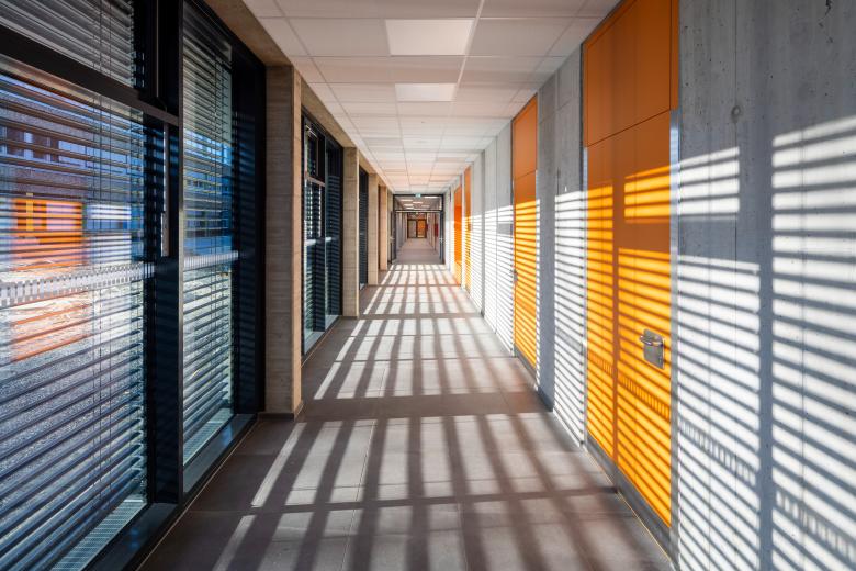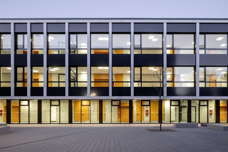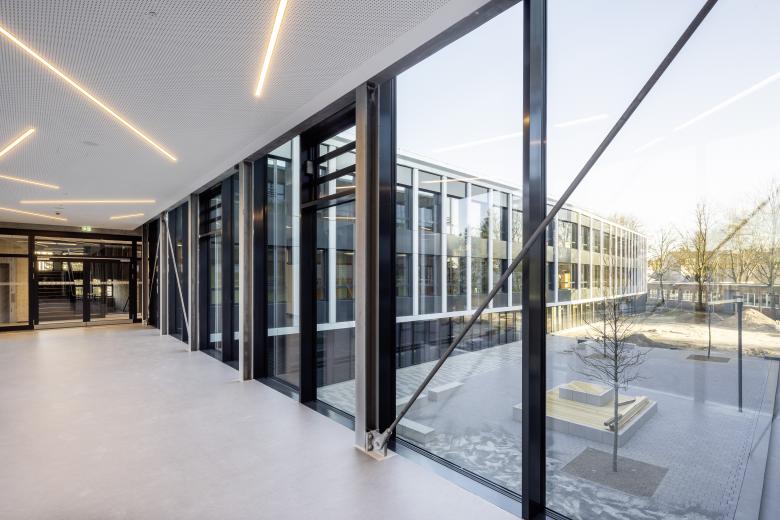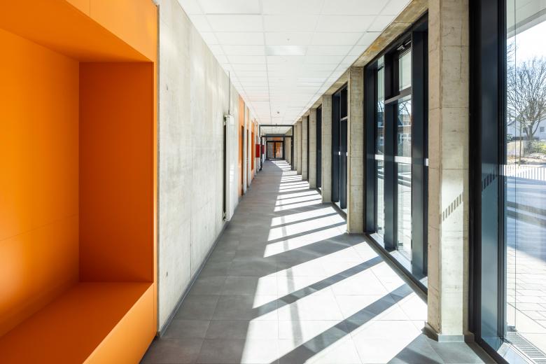 „Neue Schule im alten Gebäude“ war wiederum das Leitbild der Modernisierung des Bestandsgebäudes. Im Innenbereich bleibt lediglich die statisch notwendige Tragstruktur erhalten, um auch hier die Schule auf einen zukunftsfähigen Stand zu bringen.