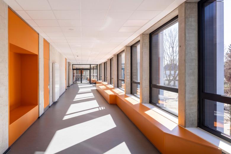 Der Neubau zur Erweiterung der Schule wird als dreigeschossiger Gebäuderiegel auf der Ostseite des Gebäudes errichtet. Die beiden Obergeschosse erhalten dabei eine Aufweitung der Flurzone, die sich in der Gebäudeform widerspiegelt und von den Nutzern als offene Lern-Aufenthaltszone genutzt werden kann. Die Anbindung an den Bestand erfolgt über eine Brücke im 1. Obergeschoss.