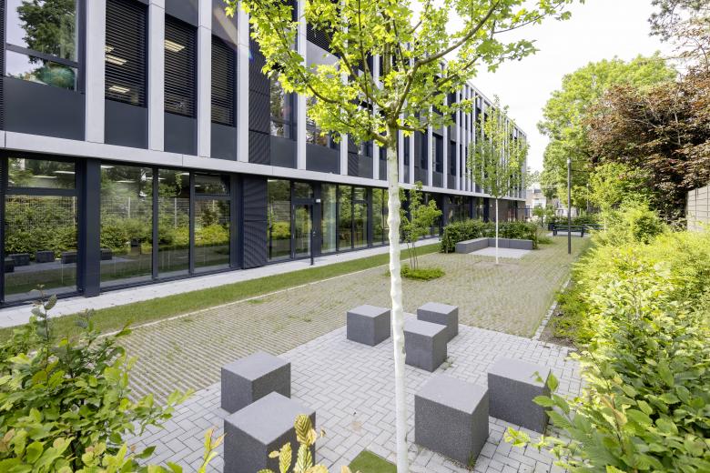 Die Gebäudeform, Zonierung und Proportion lehnen sich wie selbstverständlich der städtebaulichen Figur des sehr markanten Bestandsgebäudes an. Durch eine moderne Interpretation der Materialität wird dennoch eine selbstbewusste Eigenständigkeit entwickelt.