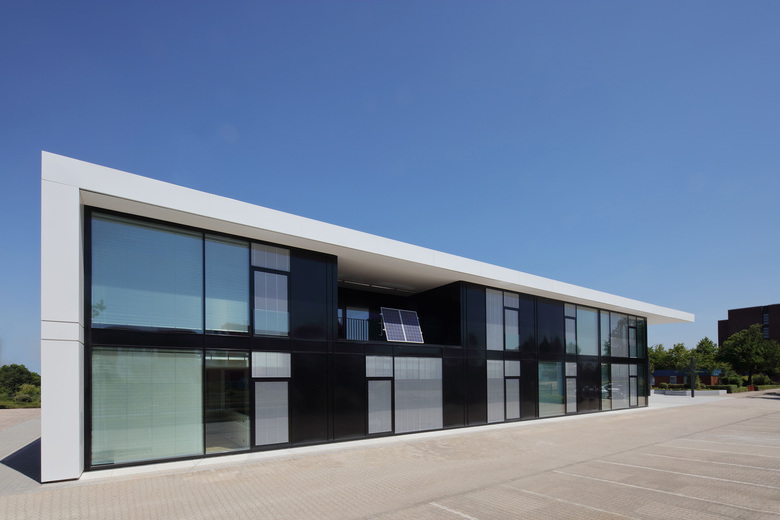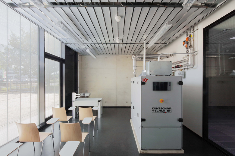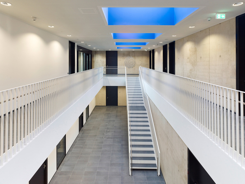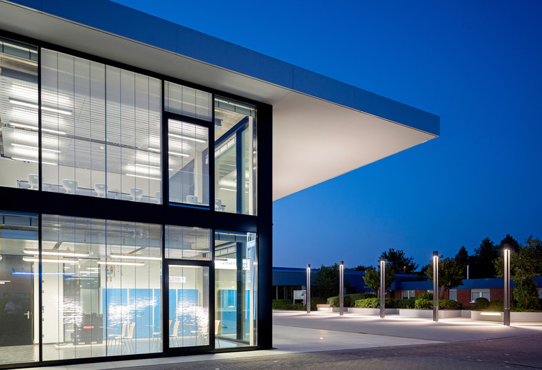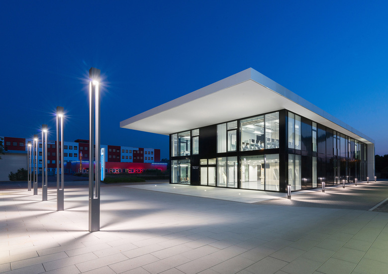 Das Handwerk steht in der deutschen Gesellschaft für höchste Präzision und Qualität. Viele Bereiche der Handwerkswirtschaft stehen zunehmend in unmittelbarer Konkurrenz zur industriellen Fertigung und Absatzmärkte verändern sich stetig. Doch die Handwerkskammern reagieren und versuchen durch innovative Angebote die Begeisterung für das Handwerk aufrecht zu erhalten. So auch die Handwerkskammer zu Köln, welche über eine Imagekampagne mit dem Slogan „Das Handwerk - die Wirtschaftsmacht von nebenan“ auf sich aufmerksam macht. Dass das Handwerk keineswegs den Anschluss durch industrielle Fertigungstechniken verloren hat, und auch in Zukunft als Wirtschaftsmacht wahrgenommen werden möchte, beweist das neue Technologie – und Bildungszentrums für Energieeffizienz und Barrierefreiheit (TBZ) der Handwerkskammer zu Köln, auf eindrucksvolle Art und Weise. Der hoch technisierte Neubau bildet einen neuen selbstbewussten städtebaulichen Auftakt für das Bildungszentrum der Handwerkskammer zu Köln. Durch die Position des Neubaus wird die Haupterschließung des Bildungszentrums aufgewertet und ein schallgeschützter Außenbereich vor der Mensa, als ein introvertierter Übungsplatz, neu geschaffen. Der Leitgedanke des Gebäudeentwurfs ist, vor dem Hintergrund des Wissensaustauschs, die Kommunikation innerhalb des Gebäudes und auch zwischen Gebäude und Außenraum zu fördern. Dies gelingt zum einen durch die Anordnung eines kommunikativen Forums, als räumlich verbindendes Element zwischen Erdgeschoss und Obergeschoss, und zum anderen durch die hoch transparente Fassade. Die Fassade des TBZ verbindet die Aspekte des kommunikativen Forums mit dem hohen technischen Standard des Neubaus auf innovative Art und Weise. Raumhohe Glasflächen im Überformat schaffen eine maximale Transparenz und fördern, durch eine bewusst erhöhte visuelle Kommunikation zwischen innen und außen, den interdisziplinären Wissensaustausch. Lichtlenkende „Köster RETROLux Lamellen“ (Computergesteuert) im Scheibenzwischenraum (3-Fach Verglasung) stellen gleichzeitig den sommerlichen Sonnenschutz und Blendschutz sicher, ohne dabei die Durchsicht (innen/außen) zu beeinträchtigen. Den geforderten Wärmedämmstandard der EnEV 2009 überschreitet das Gebäude, dank Vakuumdämmung (u.a.), mühelos um bis zu 55%. Ein intelligenter horizontaler Dachausstieg, ähnlich einem Panorama Dach im PKW, ermöglicht einen ungewohnt qualitätsvollen Zutritt auf das Gebäudedach. Hier werden in Zukunft die Schüler der Handwerkskammer den Umgang mit innovativen solartechnischen Anlagen am gebauten Beispiel erlernen.
