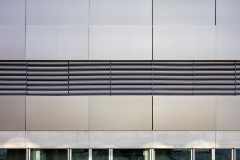 Das Dach der Halle wurde als extensiv begrünte Fläche ausgebildet. Durch die Regenrückhaltung entsteht ein Gebäude- und Umgebungskühlungseffekt, Folgen von Starkregenereignissen werden abgemildert und ein natürlicher Schutz des Daches ist gegeben. Eine Glattblechfassade lässt den verbliebenen dreigeschossigen Gebäudeteil (Grundfläche 5.000 m²) mit dem wiedererrichteten Hallenbaukörper als eine Einheit erscheinen. Im Relief der Fassade verbinden Metallbänder Alt- und Neubau miteinander. Zwischen zwei vorhanden Treppenhäusern dient ein Vordach der Adressbildung und ergänzt den Altbau mittels zwei Terrassen um Aufenthaltsmöglichkeiten. Als Beitrag zur Eindämmung von Wärmeinseln stützt die helle Farbgebung den Albedo-Effekt und reduziert so die Erwärmung der Gebäudehülle.