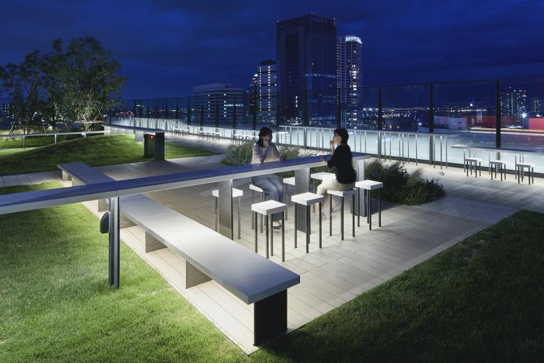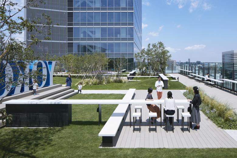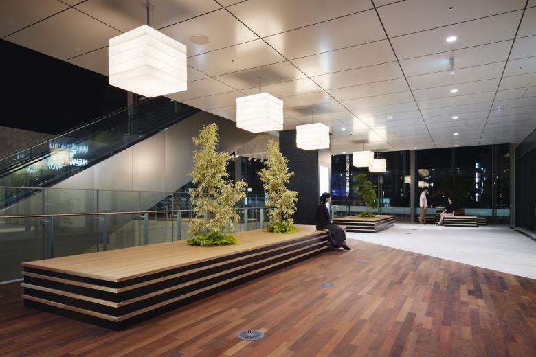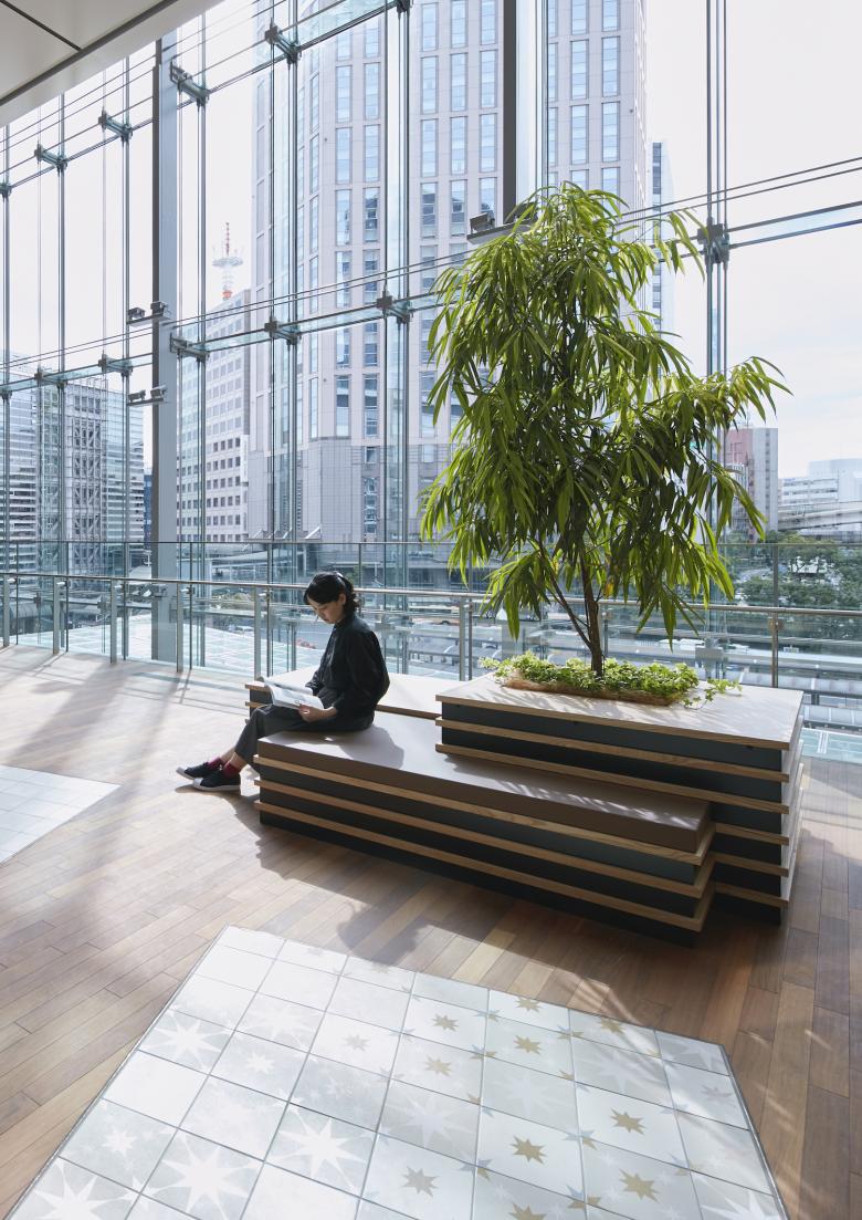 The "Umi-Sora Deck" (sea-sky) on the 12th floor of the JR Yokohama Tower is located where the tower's commercial section connects to the office section, and was planned as a public space to cater for both. On weekdays, people who work here can have lunch, hold meetings, or just work in the open space just as an extension to their own offices. On days off, people visiting the station can enjoy the view and take a break. The location was designed to be a place where mothers with children can rest and relax, a place to be enjoyed both for business and recreation.