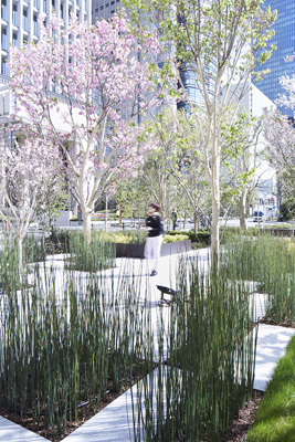 In the garden, cherry blossoms, which inform the advent of spring, are ‘arranged’ in steel vases, rather than just ‘planted’ within the planted zone. In Japan, there are more than 600 different species of cherry trees, and in this garden each different species of cherry are carefully selected and planted. Other trees are also carefully selected in order to visualize move in nature, such as wind and sunlight through swinging leaves and flowers.