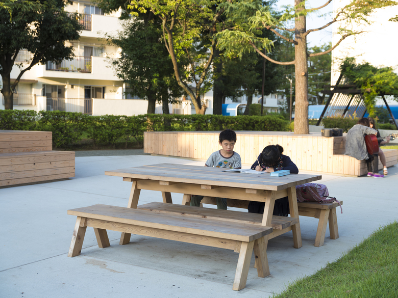 The vast apartment complex of Sakonyama holds some 4,800 units, and the renovation project of its communal plaza was lead by its own management association, a rare occurrence even by national standards. Together with the residents, we have held workshops to brainstorm ideas on how to use the space, made benches to be placed in the plaza, and placed various other features all over the plaza for everyone to enjoy the space the way they want to. These features include a pizza oven that can also double as a kitchen in times of emergency, a decking stage for public presentations, benches in the shade for reading a book or for a game of Go, and a wide grassed open space for outdoor events. Sakonyama “Minna no Niwa” (everyone’s garden) will continue to provide fresh “everyday pleasures” for the residents.