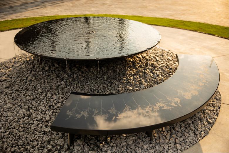The images of the golden-rayed lilies representing the facility blossom white against the black of the same granite as the water mirror. The flowers are engraved using the shot-blast method.