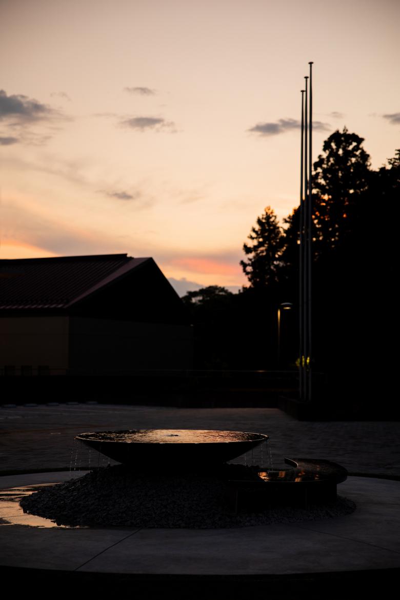 Once a month on the commemorative day, the vessel is filled with water and becomes a large water mirror. The water slowly fills the vessel from the outlet in the center, then trickles out as 19 white waterfalls from the grooves cut into the rim. As the water overflows with the vivid sky being reflected on the surface and the heart resonating sound of the falling water carried by the breeze, this place invites people to come together to interact.