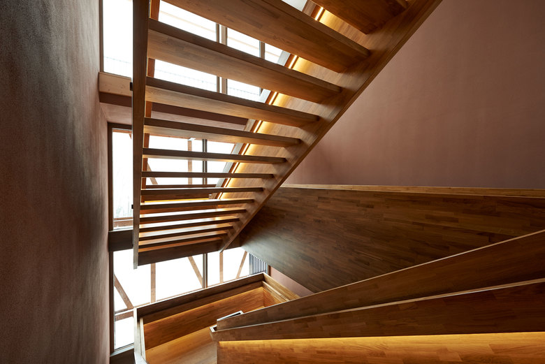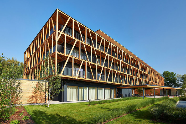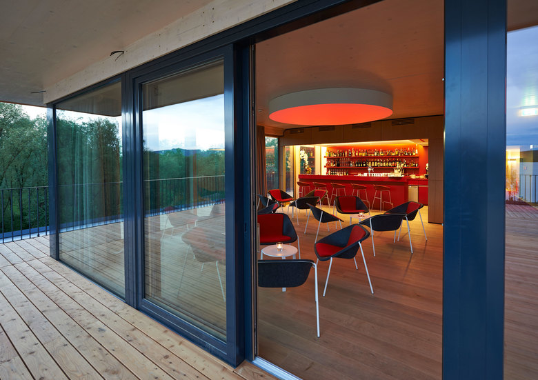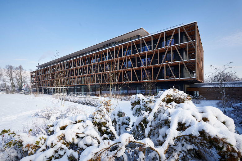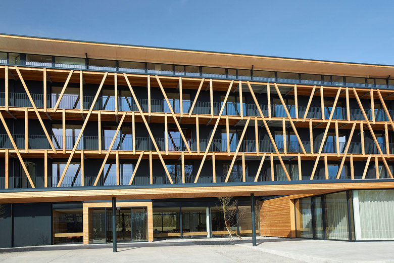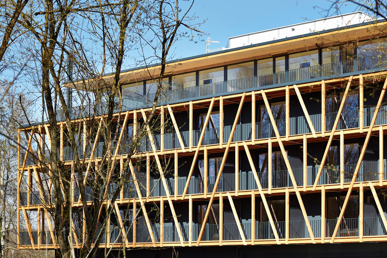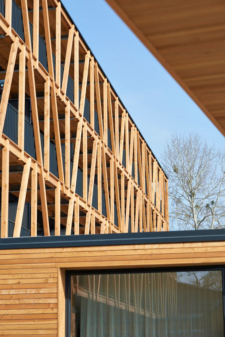 Die Fassade des Gebäudes ist durch einen dreischichtigen Aufbau charakterisiert:Aussenhaut: vertikale Holzfachwerkkonstruktion als gestaltbildende Hüllstruktur vom 1.- 3. ObergeschossTrägerroste: statisch wirksame, geschossweise umlaufende Holzroste als Zimmer und/oder Fluchtbalkone
