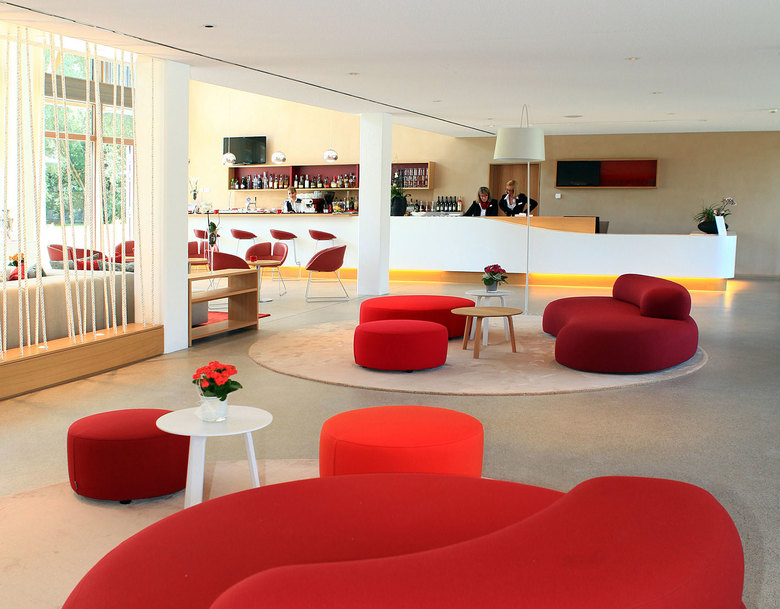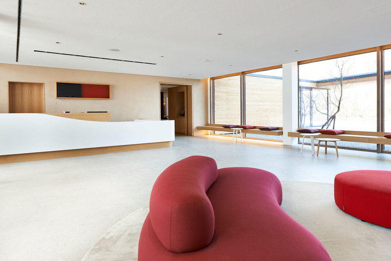 Das Hauptgebäude wird nord/östlich um einen erdgeschossigen Anbau ergänzt. Er erfüllt durch seine Position zwischen der Erschliessungsstrasse und Hotel eine optische und akustische Pufferfunktion um die so wichtige Privatheit der Gäste zu gewährleisten. Eine intensive Dachbegrünung mit Kräutergarten verstärkt diese Wirkung noch für die straßenseitigen Hotelzimmer,ohne jedoch den Blick auf Herzenpark und Seeufer zu beeinträchtigen. So erfolgt die Erschliessung des Hotels durch private Pkws und Lieferanten im Norden nahezu unbemerkt. Darüberhinaus wird der von der Hauptstrasse ankommenden Hotelgast über den zum Hotel leicht deaxialisierten Anbau wirkungsvolle auf Hotelvorplatz und Hauptzugang Bora HotSpa Resort hingeführt.