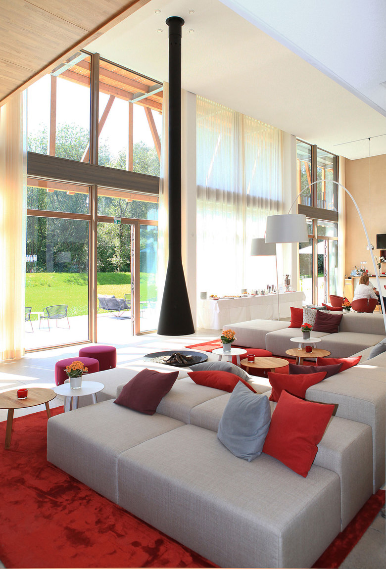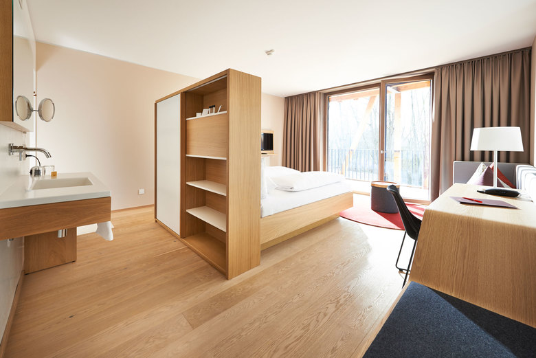 Die Nord-Süd-Achse auf der erhöhten Ebene der Obergeschosse und Sky-Bar unterstreicht hingegen die Verbindung zum Seeufer und ermöglicht von den Zimmern und Erschließungsfluren eine privilegierte Sicht auf den See. Die süd/westlich dem Hotel vorgelagerte Japansauna stellt eine funktionale Erweiterung des Bora Saunaareals dar und fungiert zugleich als wichtiges Bindeglied zwischen dem Hotel und HotSpa Bereich. Die Japansasuna verhindert durch ihre Anordnung jedoch auch störende Blickbeziehungen zwischen den Hotelzimmern und dem bestehenden Bora-Sauna-FKK-Gelände.
