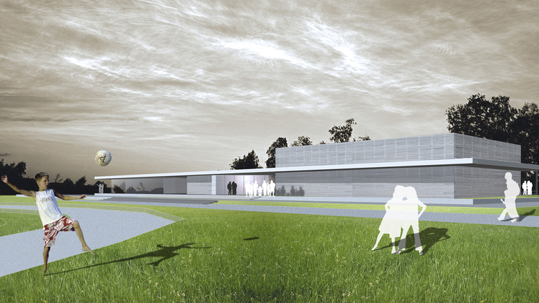 Wettbewerbsentwurf für das Haus der Bürger und Vereine beim Sportclub Pöcking am Starnberger See, Ankauf. Umfang: Gastronomie, Veranstaltungssaal, Kegelbahn, Schießanlage. 2.600 qm BGF