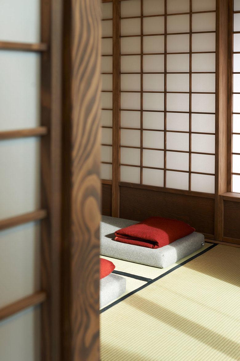 Herumgrppiert im EG eine Bambus- und Dampfsauna, Umkleiden, Waschräume mit japanischen Sitzduschen. Im OG konventionell möblierte Ruhezonen im Wechsel mit traditionellen, mittels Shoji Wände abgetrennten, Tatamiräumen