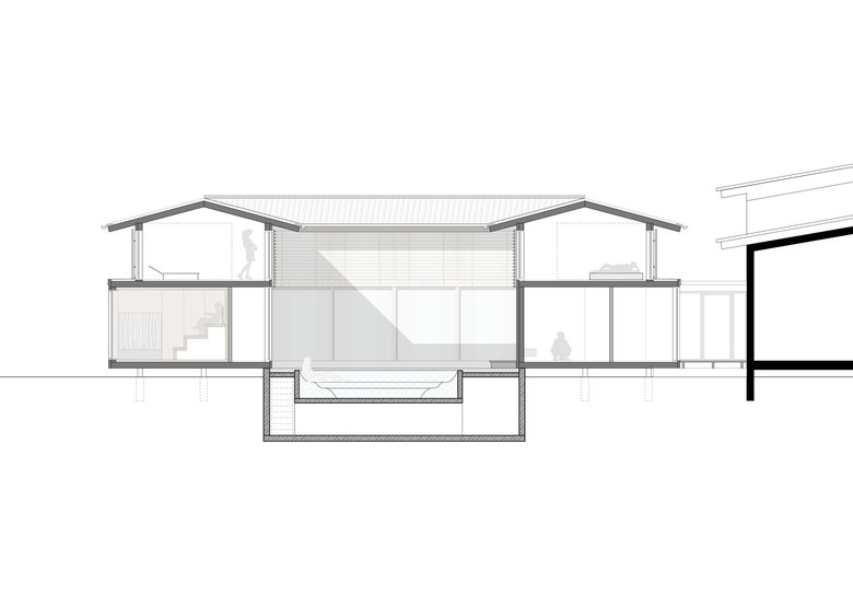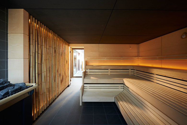 Das neue Saunahaus orientiert sich typologisch an den steinzeitlichen Pfahlbauten des Bodensees, es steht aufgeständert halb im Wasser und halb am Land. Das Gebäude ist im Stil eines Sentõs, eines japanischen Badehauses, gestaltet und soll den Gast auf eine Reise in das Reich der aufgehenden Sonnen entführen.So bildet der Onsen, ein Heisswasserbecken, in einem klimaoffenen Innenhof gelegen, das Zentrum des Gebäudes. Hierum gruppieren sich im Erdgeschoss eine Bambus- und Dampfsauna, Umkleiden sowie Waschräume u.a. mit japanischen Sitzduschen. Im Obergeschoss befindet sich Ruhezonen die gleichermassen loungeartig modern und als traditionelle Tatamiräume mit Shoji Wänden ausgebildet sind